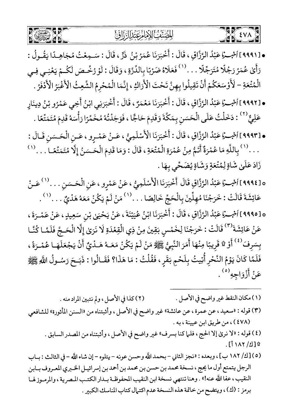 9993- أخبرنا عبد الرزاق، قَالَ: أَخْبَرَنَا الأَسْلَمِيُّ، عن عمرو، عَنِ الْحَسَنِ قَالَ:.... بالله ما عمرة أتم من عمرة المتعة، قَالَ: وما قدم الحسن إلا متمتعًا.... زاد على شاة لمتعة، وشاة يضحي بها.