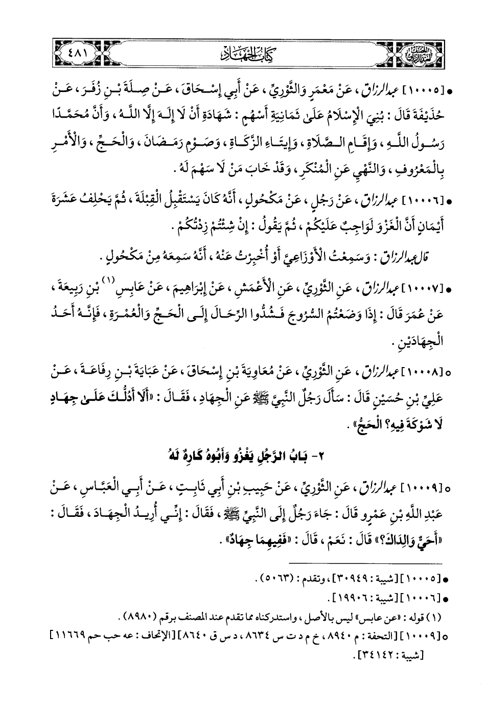 10009- عبد الرزاق، عَنِ الثَّورِيِّ، عَن حَبِيبِ بْنِ أَبِي ثَابِتٍ، عَنْ أَبِي الْعَبَّاسِ، عَنْ عَبدِ اللهِ بْنِ عَمْرٍو، قَالَ: جَاءَ رَجُلٌ إِلَى النَّبِيِّ صَلَّى اللهُ عَلَيْهِ وَسَلَّمَ، فَقَالَ: إِنِّي أُرِيدُ الْجِهَادَ، فَقَالَ: أَحَيٌّ وَالِدَاكَ؟ قَالَ: نَعَمْ، قَالَ: فَفِيهِمَا جِهَادٌ.