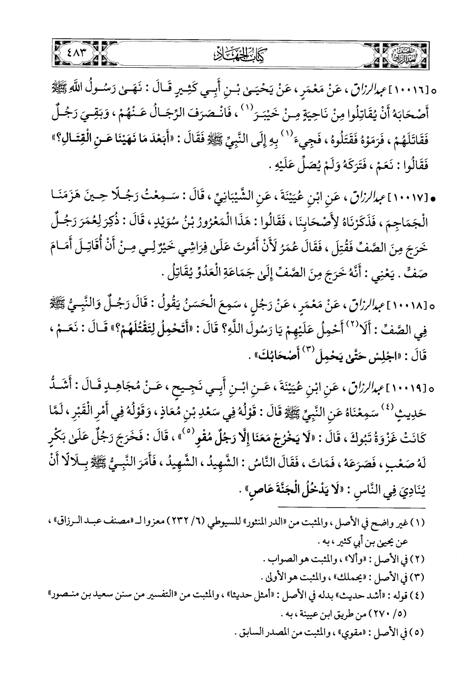 10016- عبد الرزاق، عَنْ مَعْمَرٍ، عَن يَحيَى بنِ أَبِي كَثِيرٍ، قَالَ: نَهَى رَسُولُ اللهِ صَلَّى اللهُ عَلَيْهِ وَسَلَّمَ أَصْحَابَهُ أَنْ يُقَاتِلُوا مِنْ نَاحِيَةٍ مِنْ خيْبَرَ، فَانْصَرَفَ الرِّجَالُ عَنْهُمْ، وَبَقِيَ رَجُلٌ فَقَاتَلَهُمْ، فَرَمَوْهُ، فَقَتَلُوهُ، فَجِيءَ بِهِ إِلَى النَّبِيِّ صَلَّى اللهُ عَلَيْهِ وَسَلَّمَ فَقَالَ: أَبَعْدَ مَا نَهَيْنَا عَنِ الْقِتَالِ؟ فَقَالُوا: نَعَمْ، فَتَرَكَهُ، وَلَمْ يُصَلِّ عَلَيْهِ.