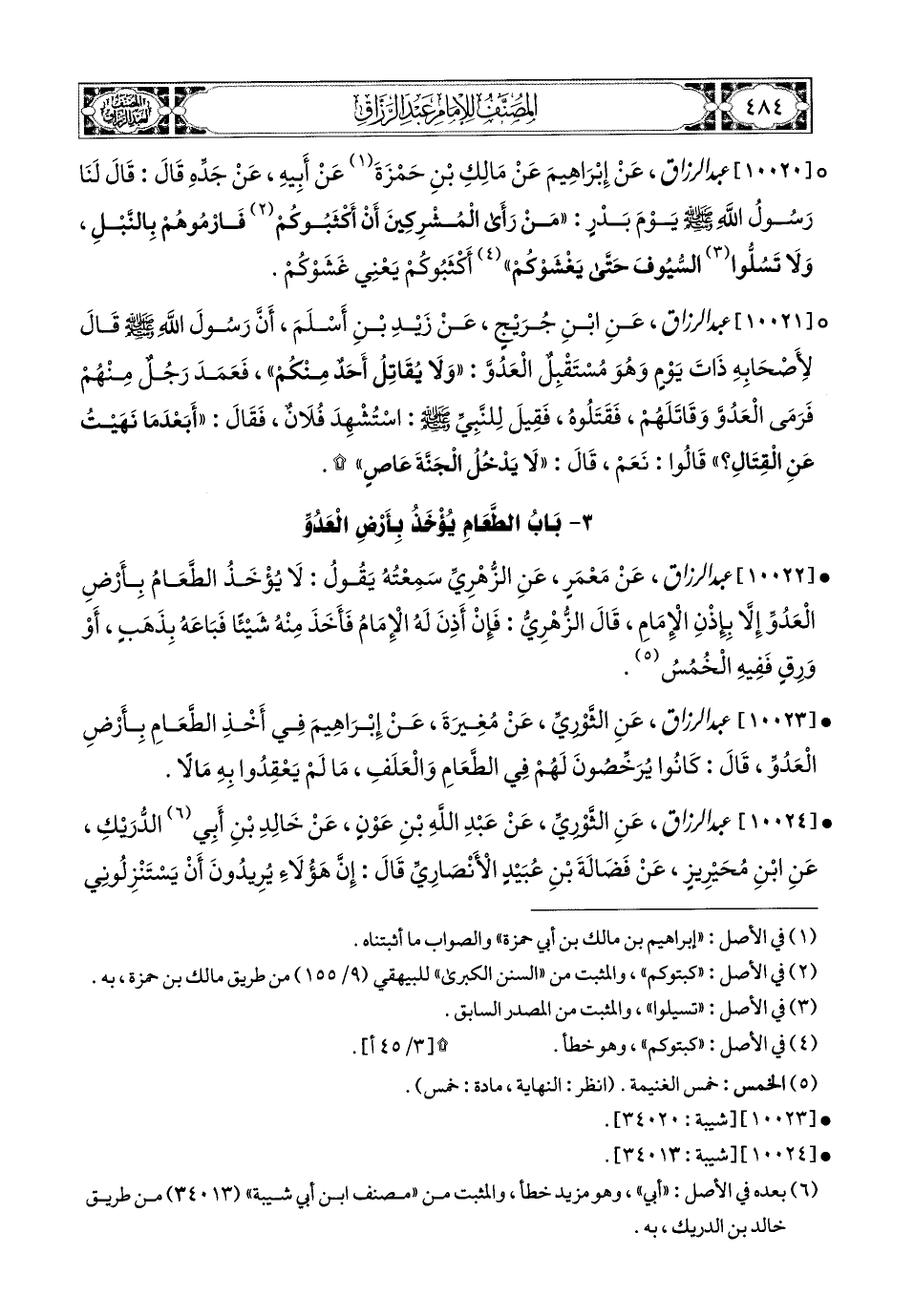 10022- عبد الرزاق، عَنْ مَعْمَرٍ، عَنِ الزُّهْرِيِّ، سَمِعْتُهُ يَقُولُ: لاَ يُؤْخَذُ الطَّعَامُ بِأَرْضِ الْعَدُوِّ إِلاَّ بِإِذْنِ الإِمَامِ.