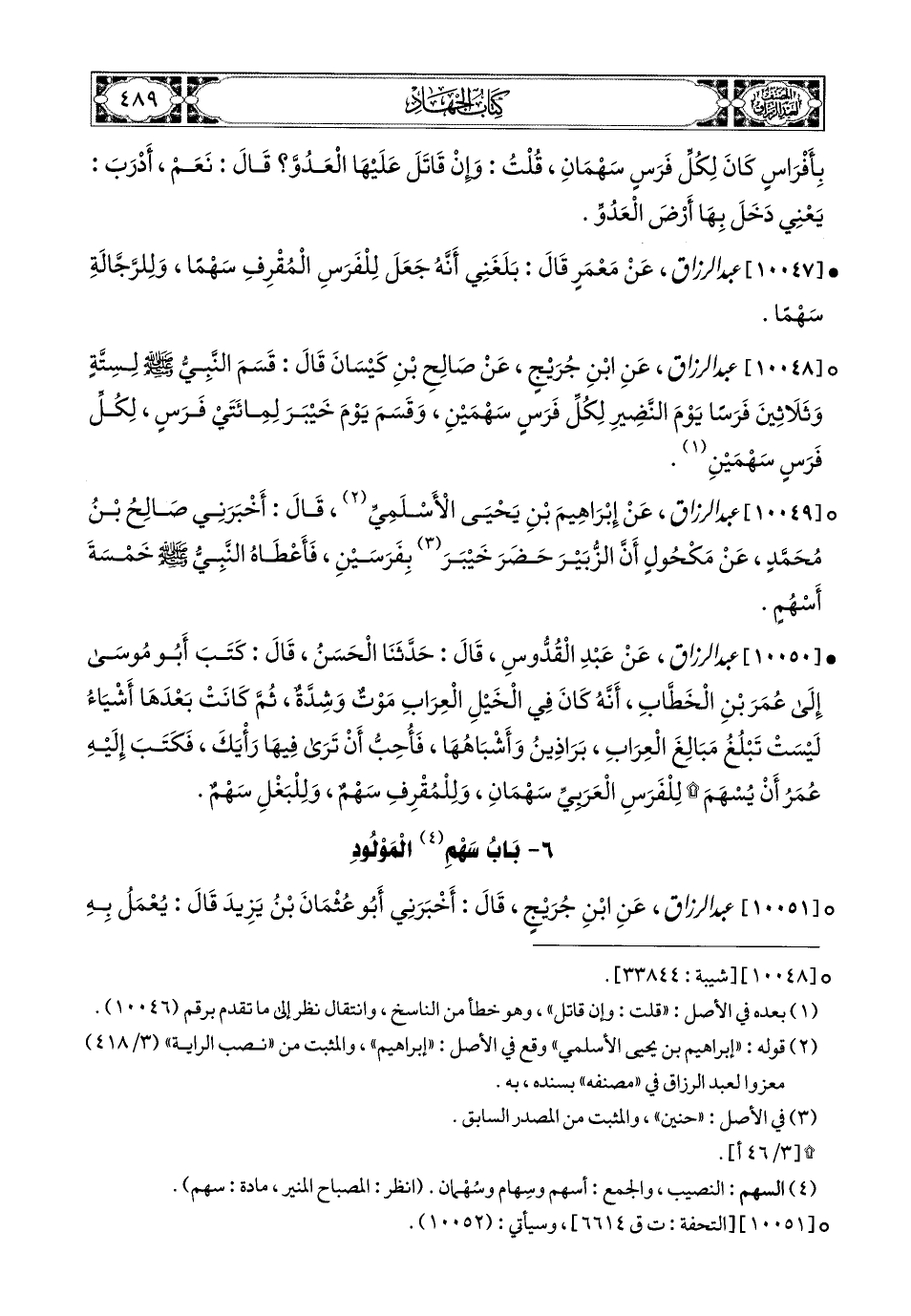10048- عبد الرزاق، عَنِ ابْنِ جُرَيْجٍ، عَن صَالِحِ بْنِ كَيْسَانَ، قَالَ: قَسَمَ النَّبِيُّ صَلَّى اللهُ عَلَيْهِ وَسَلَّمَ لِسِتَّةٍ وَثَلاَثِينَ فَرَسًا يَوْمَ النَّضِيرِ لِكُلِّ فَرَسٍ سَهْمَيْنِ، وَقَسَمَ يَوْمَ خَيْبَرٍ لِمِئَتَيْ فَرَسٍ، لِكُلِّ فَرَسٍ سَهْمَيْنِ.