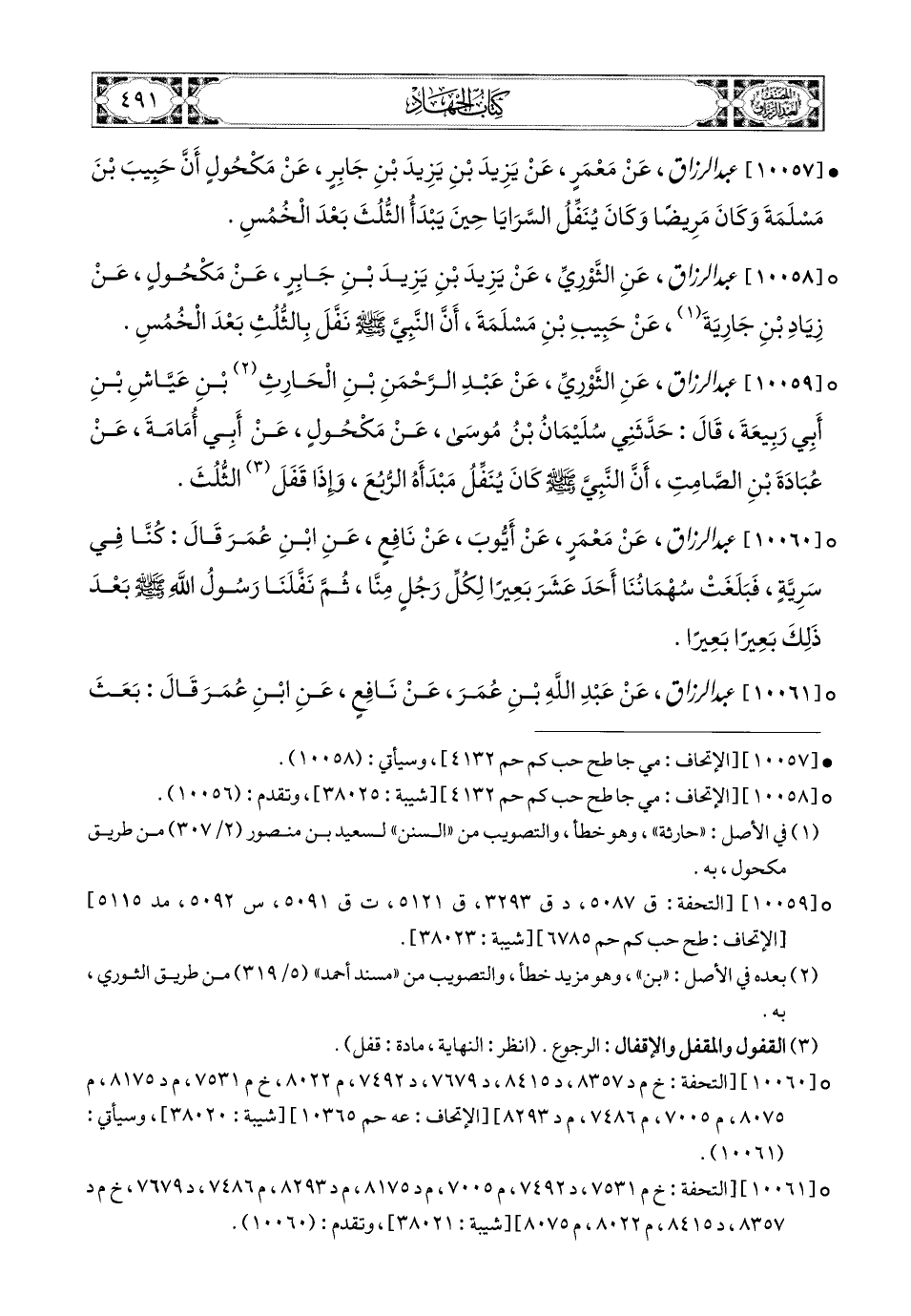 10060- عبد الرزاق، عَنْ مَعْمَرٍ، عَنْ أَيُّوبَ، عَن نَافِعٍ، عَنِ ابْنِ عُمَرَ، قَالَ: كُنَّا فِي سَرِيَّةٍ، فَبَلَغَتْ سُهْمَانُنَا أَحَدَ عَشَرَ بَعِيرًا، لِكُلِّ رَجُلٍ مِنَّا، ثُمَّ نَفَّلَنَا رَسُولُ اللهِ صَلَّى اللهُ عَلَيْهِ وَسَلَّمَ بَعْدَ ذَلِكَ بَعِيرًا بَعِيرًا.