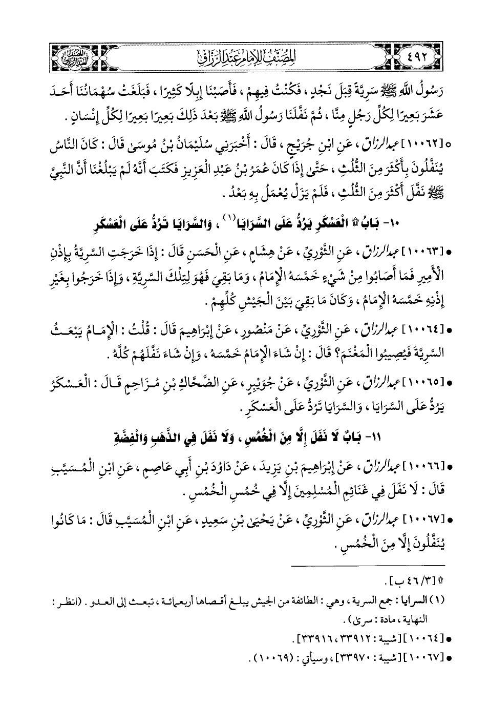 10064- عبد الرزاق، عَنِ الثَّورِيِّ، عَنْ مَنصُورٍ، عَن إِبرَاهِيمَ، قَالَ: قُلْتُ: الإِمَامُ يَبْعَثُ السَّرِيَّةَ فَيُصِيبُوا المَغْنَمَ؟ قَالَ: إِنْ شَاءَ الإِمَامُ خَمَّسَهُ، وَإِنْ شَاءَ نَفَّلَهُمْ كُلَّهُ.