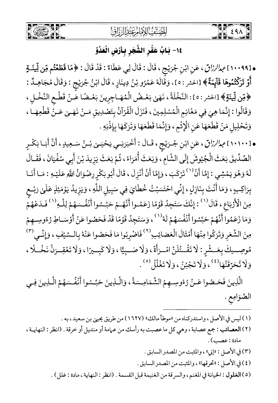 10099- عبد الرزاق، عَنِ ابْنِ جُرَيْجٍ، قَالَ: قَالَ لِي عَطَاءٌ: قَدْ قَالَ: {مَا قَطَعْتُمْ مِنْ لِينَةٍ أَوْ تَرَكْتُمُوهَا قَائِمَةً} وَقَالَهُ عَمْرُو بن دِينَارٍ، قَالَ ابْنُ جُرَيْجٍ: وَقَالَ مُجاهِدٌ: {مِنْ لِينَةٍ}: النَّخْلَةُ، نَهَى بَعْضُ المُهَاجِرِينَ بَعْضًا عَن قَطْعِ النَّخْلِ، وَقَالُوا: إِنَّمَا هِيَ فِي مَغَانِمِ المُسْلِمِينَ، فَنَزَلَ الْقُرْآنُ بِتَصْدِيقِ مَنْ نَهَى عَن قَطْعِهَا، وَتَحْلِيلِ مَنْ قَطَعَهَا عَنِ الإِثْمِ، وَإِنَّمَا قَطْعُهَا وَتَرْكُهَا بِإِذْنِهِ.