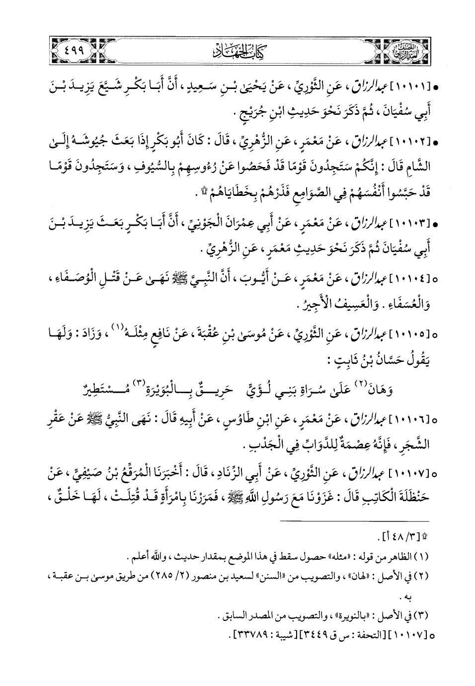 10105- عبد الرزاق، عَنِ الثَّورِيِّ، عَن مُوسَى بنِ عُقْبَةَ، عَن نَافِعٍ، مِثْلَهُ، وَزَادَ: وَلَهَا يَقُولُ حَسَّانُ بن ثَابِتٍ: