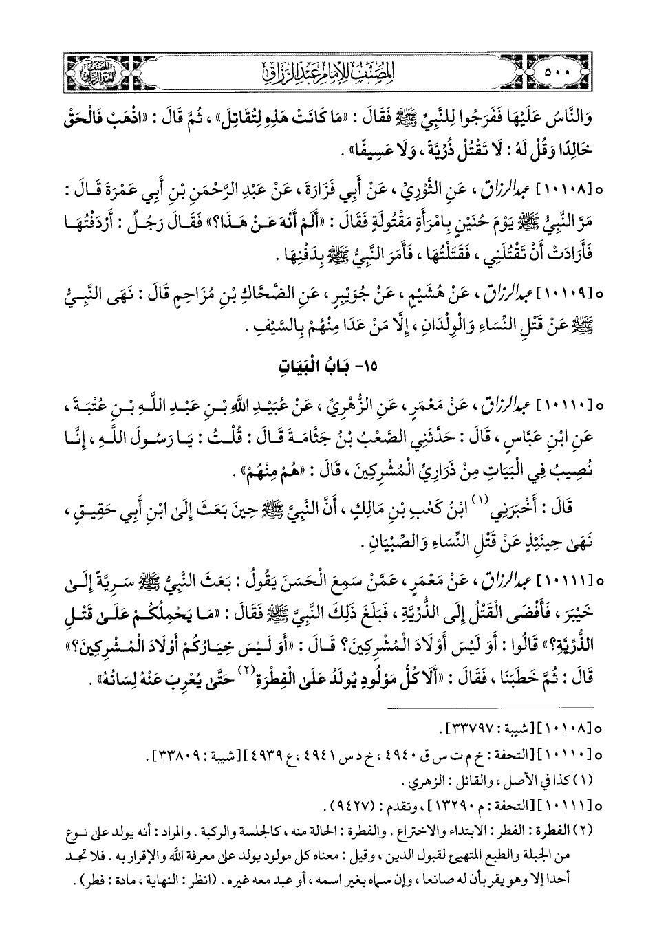 10110- عبد الرزاق، عَنْ مَعْمَرٍ، عَنِ الزُّهْرِيِّ، عَن عُبَيْدِ اللهِ بْنِ عَبدِ اللهِ بْنِ عُتْبَةَ، عَنِ ابْنِ عَبَّاسٍ، قَالَ: حَدَّثَنِي الصَّعْبُ بن جَثَّامَةَ قَالَ: قُلْتُ: يَا رَسُولَ اللهِ، إِنَّا نُصِيبُ فِي الْبَيَاتِ مِنْ ذَرَارِي المُشْرِكِينَ، قَالَ: هُمْ مِنْهُمْ.