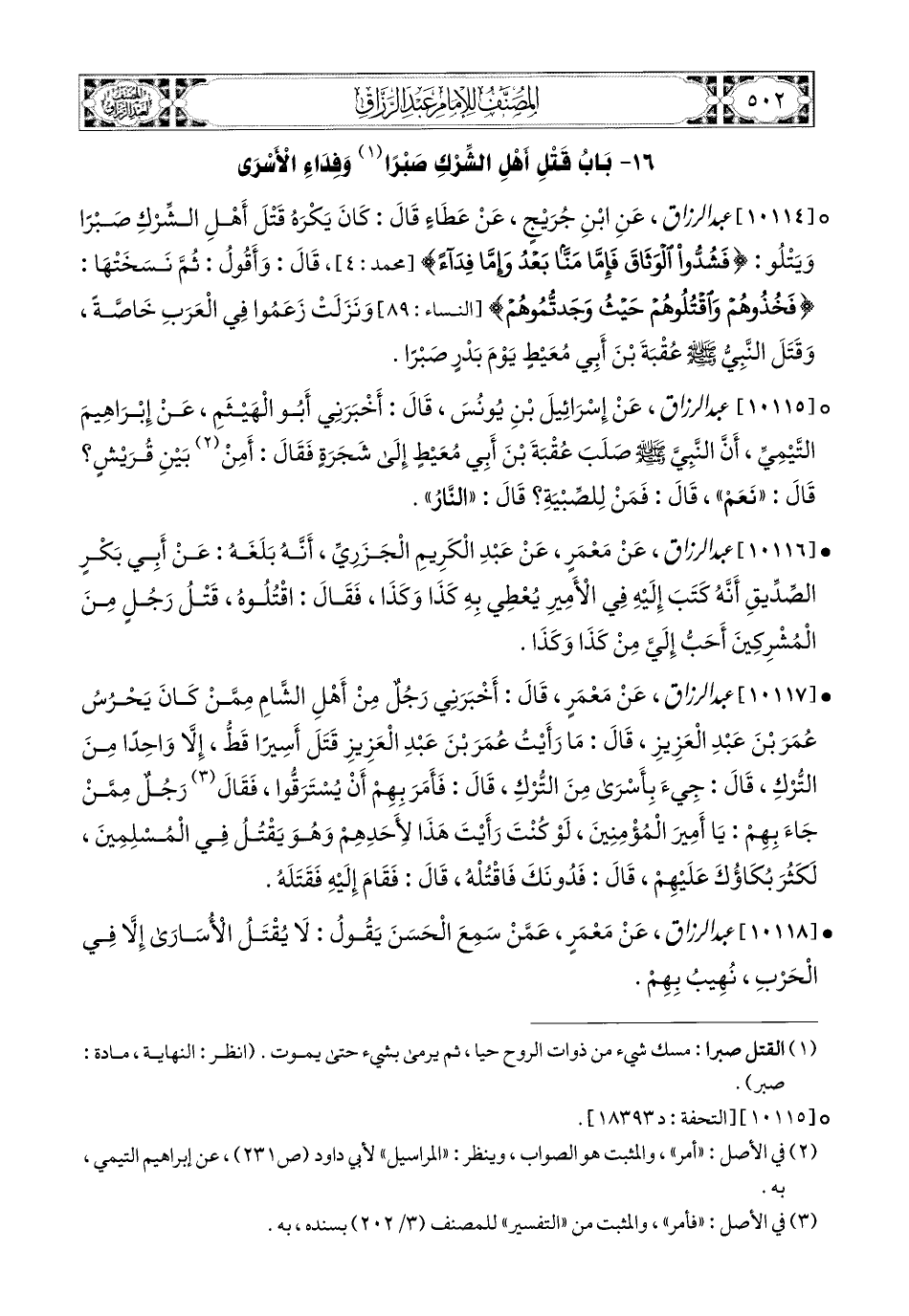10114- عبد الرزاق، عَنِ ابْنِ جُرَيْجٍ، عَنْ عَطَاءٍ، قَالَ: كَانَ يَكْرَهُ قَتْلَ أَهْلِ الشِّرْكِ صَبْرًا، وَيَتْلُو: {فَشُدُّوا الْوَثَاقَ فَإِمَّا مَنًّا بَعْدُ وَإِمَّا فِدَاءً} قَالَ: وَأَقُولُ: ثُمَّ نَسَخَتْهَا: {فَخُذُوهُمْ وَاقْتُلُوهُمْ حَيْثُ وَجَدْتُمُوهُمْ} وَنَزَلَتْ، زَعَمُوا فِي الْعَرَبِ خَاصَّةً، وَقَتَلَ النَّبِيُّ صَلَّى اللهُ عَلَيْهِ وَسَلَّمَ عُقْبَةَ بن أَبِي مُعَيْطٍ يَوْمَ بَدْرٍ صَبْرًا.