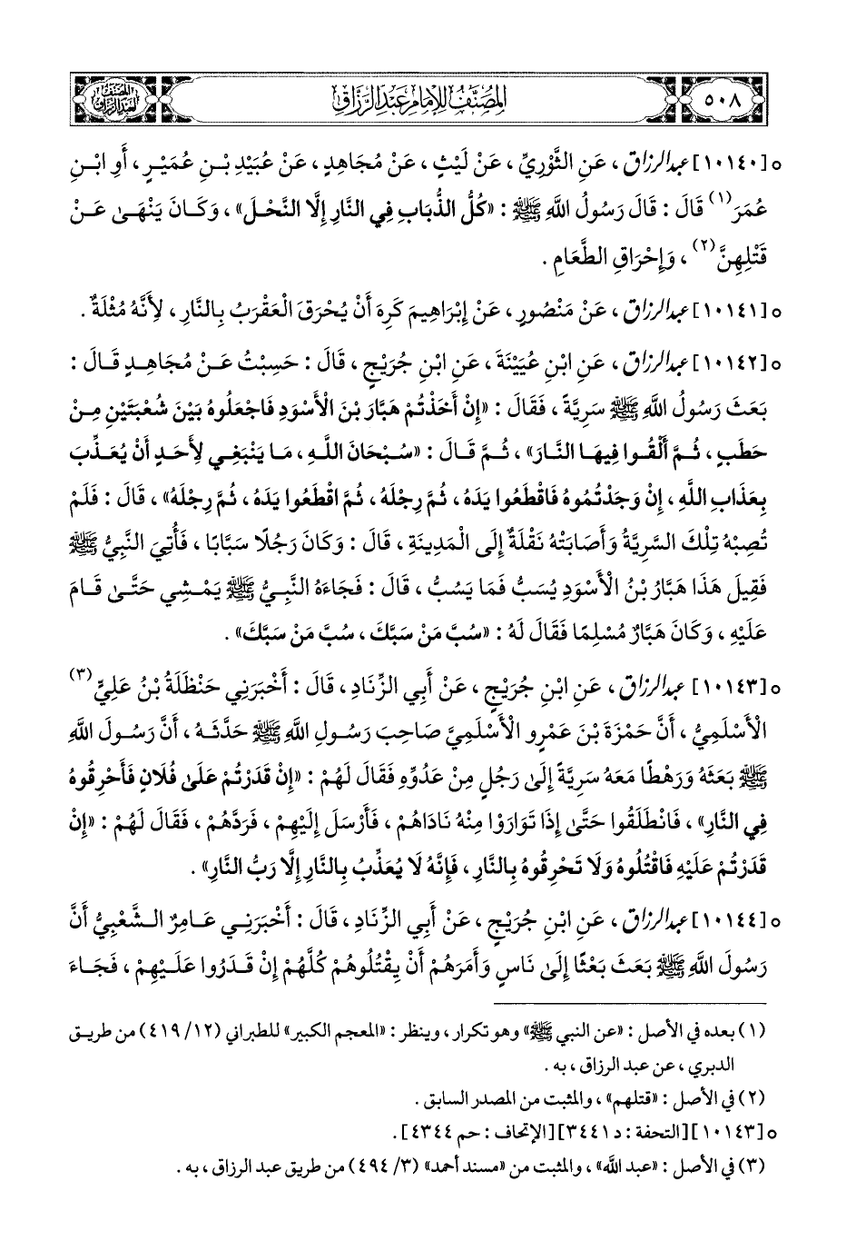 10142- عبد الرزاق، عَنِ ابْنِ عُيَيْنَةَ، عَنِ ابْنِ جُرَيْجٍ، قَالَ: حَسِبْتُ عَن مُجاهِدٍ قَالَ: بَعَثَ رَسُولُ اللهِ صَلَّى اللهُ عَلَيْهِ وَسَلَّمَ سَرِيَّةً، فَقَالَ: إِنْ أَخَذْتُمْ هَبَّارَ بْنِ الأَسْوَدِ، فَاجْعَلُوهُ بَيْنَ شُعْبَتَيْنِ مِنْ حَطَبٍ، ثُمَّ أَلْقُوا فِيهَا النَّارَ، ثُمَّ قَالَ: سُبْحَانَ اللهِ، مَا يَنْبَغِي لأَحَدٍ أَنْ يُعَذِّبَ بِعَذَابِ اللهِ، إِنْ وَجَدْتُمُوهُ، فَاقْطَعُوا يَدَهُ، ثُمَّ رِجْلَهُ، ثُمَّ اقْطَعُوا يَدَهُ، ثُمَّ رِجْلَهُ، قَالَ: فَلَمْ تُصِبْهُ تِلْكَ السَّرِيَّةُ، وَأَصَابَتْهُ نَقْلَةٌ إِلَى المَدِينَةِ، قَالَ: وَكَانَ رَجُلاً سَبَّابًا، فَأُتِيَ النَّبِيُّ صَلَّى اللهُ عَلَيْهِ وَسَلَّمَ، فَقِيلَ: هَذَا هَبَّارُ بن الأَسْوَدِ يُسَبُّ، فَمَا يَسُبُّ، قَالَ: فَجَاءَهُ النَّبِيُّ صَلَّى اللهُ عَلَيْهِ وَسَلَّمَ يَمْشِي، حَتَّى قَامَ عَلَيْهِ، وَكَانَ هَبَّارُ مُسْلِمًا، فَقَالَ لَهُ: سُبَّ مَنْ سَبَّكَ، سُبَّ مَنْ سَبَّكَ.