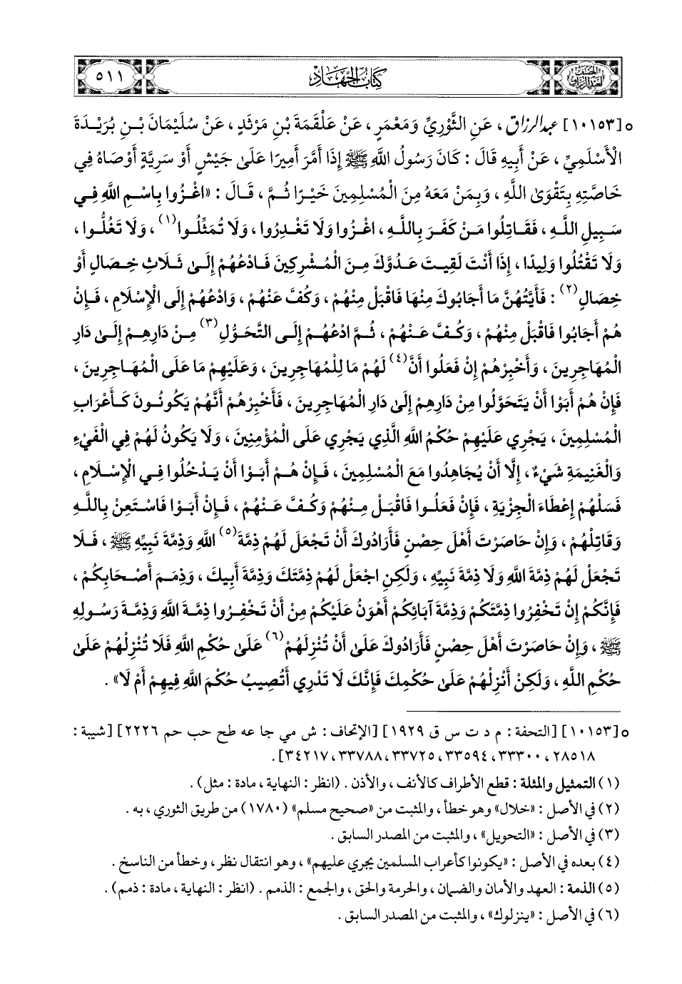 10153 - عبد الرزاق، عَنِ الثَّورِيِّ، وَمَعْمَرٍ، عَنْ عَلْقَمَةَ بْنِ مَرْثَدٍ، عَن سُلَيْمَانَ بْنِ بُرَيْدَةَ الأَسْلَمِيِّ، عَنْ أَبِيهِ، قَالَ: كَانَ رَسُولَ اللهِ صَلَّى اللهُ عَلَيْهِ وَسَلَّمَ إِذَا أَمَّرَ أَمِيرًا عَلَى جَيْشٍ، أَوْ سَرِيَّةٍ، أَوْصَاهُ فِي خَاصَّته (1) بِتَقْوَى اللهِ، وَبِمَنْ مَعَهُ مِنَ المُسْلِمِينَ خَيْرًا، ثُمَّ قَالَ: اغْزُوا بِسْمِ اللهِ، فِي سَبِيلِ اللهِ، فَقَاتِلُوا مَنْ كَفَرَ باللهِ، اغْزُوا وَلاَ تَغْدُرُوا، وَلاَ تُمَثِّلُوا، وَلاَ تَغُلُّوا، وَلاَ تَقْتُلُوا وَلِيدًا، إِذَا (2) أَنْتَ لَقِيتَ عَدُوِّكَ مِنَ المُشْرِكِينَ، فَادْعُهُمْ إِلَى ثَلاَثِ خِصَالٍ، أَوْ خِلاَلٍ (3): فَأَيَّتُهُنَّ مَا أَجَابُوكَ مِنْهَا فَاقْبَلْ مِنْهُمْ، وَكُفَّ عَنْهُمْ، وَادْعُهُمْ إِلَى الإِسْلاَمِ، فَإِنْ هُمْ أَجَابُوا، فَاقْبَلْ مِنْهُمْ، وَكُفَّ عَنْهُمْ، ثُمَّ ادْعُهُمْ إِلَى التَّحَوُّلِ مِنْ دَارِهِمْ إِلَى دَارِ المُهَاجِرِينَ، وَأَخْبِرْهُمْ إِنْ فَعَلُوا أَنَّ لَهُمْ مَا لِلْمُهَاجِرِينَ، وَعَلَيْهِمْ مَا عَلَى المُهَاجِرِينَ، فَإِنْ هُمْ أَبَوْا أَنْ يَتَحَوَّلُوا مِنْ دَارِهِمْ إِلَى دَارِ المُهَاجِرِينَ، فَأَخْبِرْهُمْ أَنَّهُمْ يَكُونُونَ كَأَعَرَابِ المُسْلِمِينَ، يَجْرِي عَلَيْهِمْ حُكْمُ اللهِ الَّذِي يَجْرِي عَلَى المُؤْمِنِينَ، وَلاَ يَكُونُ لَهُمْ فِي الْفَيْءِ وَالْغَنِيمَةِ شَيْءٌ، إِلاَّ أَنْ يُجَاهِدُوا مَعَ المُسْلِمِينَ، فَإِنْ هُمْ أَبَوْا أَنْ يَدْخُلُوا فِي الإِسْلاَمِ، فَسَلْهُمْ إِعْطَاءَ الْجِزْيَةِ، فَإِنْ فَعَلُوا فَاقْبَلْ مِنْهُمْ، وَكُفَّ عَنْهُمْ، فَإِنْ أَبَوْا فَاسْتَعِنْ باللهِ وَقَاتِلْهُمْ، وَإِنْ حَاصَرْتَ أَهْلَ حِصْنٍ، فَأَرَادُوكَ أَنْ تَجْعَلَ لَهُمْ ذِمَّةَ اللهِ وَذِمَّةِ نَبِيِّهِ صَلَّى اللهُ عَلَيْهِ وَسَلَّمَ، فَلاَ تَجْعَلْ لَهُمْ ذِمَّةَ اللهِ وَلاَ ذِمَّةَ نَبِيِّهِ، وَلَكِنِ اجْعَلْ لَهُمْ ذِمَّتَكَ وَذِمَّةَ أَبِيكَ، وَذِمَمَ أَصْحَابِكُمْ، فَإِنَّكُمْ إِنْ تَخْفِرُوا ذِمَّتَكُمْ وَذِمَّةَ آبَائِكُمْ أَهْوَنَ عَلَيْكُمْ مِنْ أَنْ تَخْفِرُوا ذِمَّةَ اللهِ وَذِمَّةَ رَسُولِهِ صَلَّى اللهُ عَلَيْهِ وَسَلَّمَ، وَإِنْ حَاصَرْتَ أَهْلَ حِصْنٍ فَأَرَادُوكَ عَلَى أَنْ تُنْزِلَهُمْ عَلَى حُكْمِ اللهِ فَلاَ تُنْزِلْهُمْ عَلَى حُكْمِ اللهِ، وَلَكِنْ أَنْزِلْهُمْ عَلَى حُكْمِكَ، فَإِنَّكَ لاَ تَدْرِي أَتُصِيبَ حُكْمَ اللهِ فِيهِمْ أَمْ لاَ.