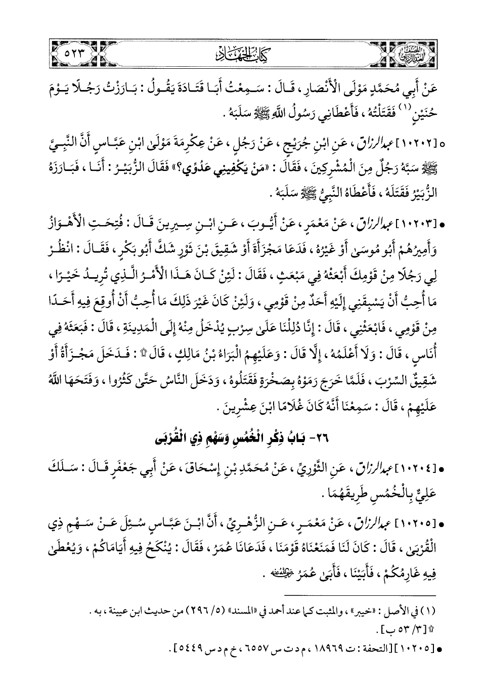 10202- عبد الرزاق، عَنِ ابْنِ جُرَيْجٍ، عَن رَجُلٍ، عَنْ عِكْرِمَةَ، مَوْلَى ابْنِ عَبَّاسٍ؛ أَنَّ النَّبِيَّ صَلَّى اللهُ عَلَيْهِ وَسَلَّمَ سَبَّهُ رَجُلٌ مِنَ المُشْرِكِينَ، فَقَالَ: مَنْ يَكْفِينِي عَدُوِّي؟ فَقَالَ الزُّبَيْرُ: أَنَا، فَبَارَزَهُ الزُّبَيْرُ، فَقَتَلَهُ، فَأَعْطَاهُ النَّبِيُّ صَلَّى اللهُ عَلَيْهِ وَسَلَّمَ سَلَبَهُ.