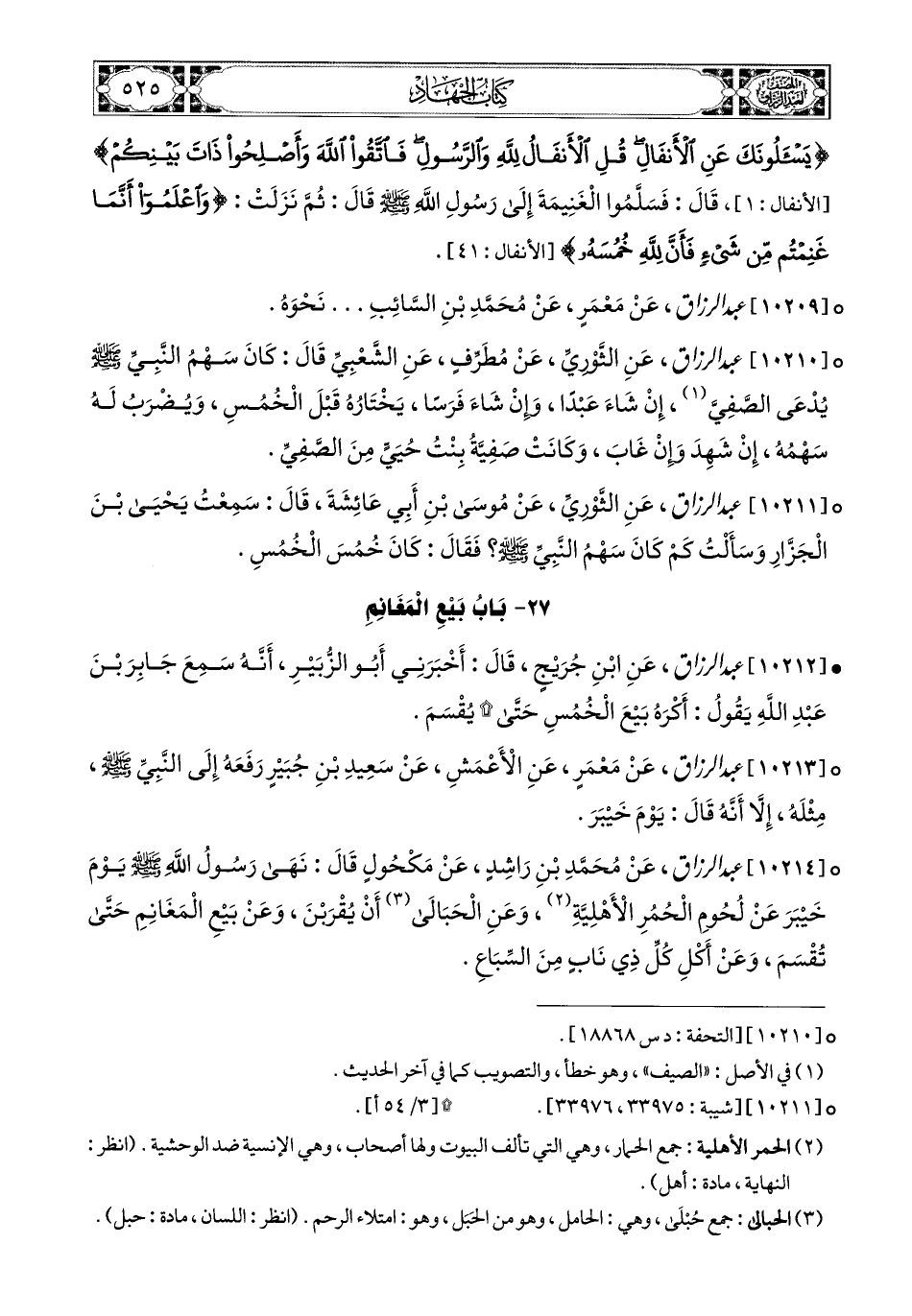 10211- عبد الرزاق، عَنِ الثَّورِيِّ، عَن مُوسَى بنِ أَبِي عَائِشَةَ، قَالَ: سَمِعْتُ يَحيَى بن الْجَزَّارِ، وَسَأَلْتُ: كَمْ كَانَ سَهْمُ النَّبِيِّ صَلَّى اللهُ عَلَيْهِ وَسَلَّمَ؟ فَقَالَ: كَانَ خُمُسَ الْخُمُسِ.