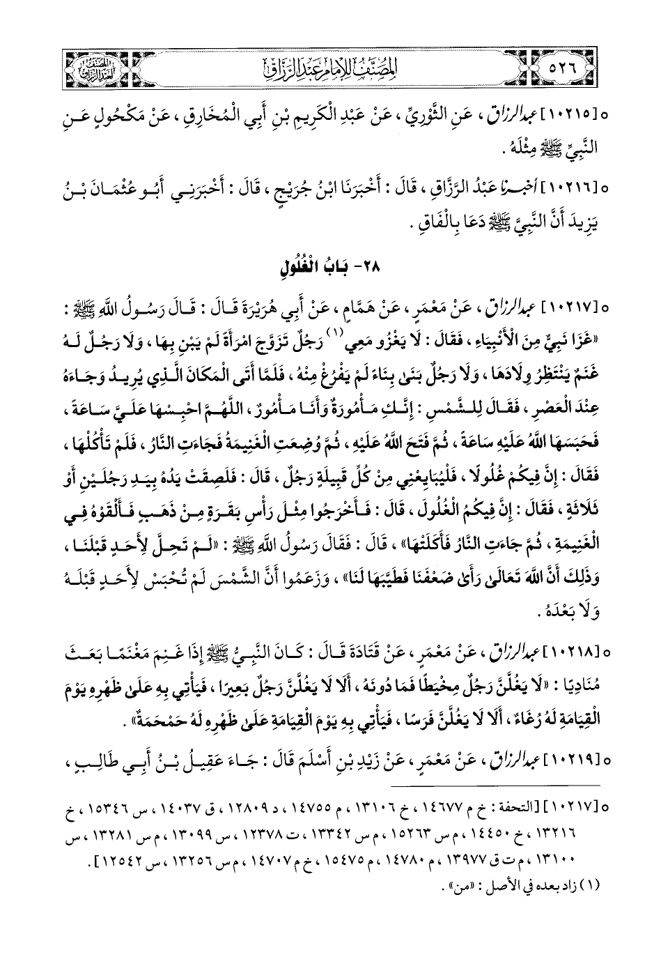 10217- عبد الرزاق، عَنْ مَعْمَرٍ، عَن هَمَّامٍ، عَنْ أَبِي هُرَيرَةَ، قَالَ: قَالَ رَسُولُ اللهِ صَلَّى اللهُ عَلَيْهِ وَسَلَّمَ: غَزَا نَبِيٌّ مِنَ الأَنْبِيَاءِ، فَقَالَ: لاَ يَغْزُو مَعِي رَجُلٌ تَزَوَّجَ امْرَأَةً لَمْ يَبْنِ بِهَا، وَلاَ رَجُلٌ لَهُ غَنَمٌ يَنْتَظِرُ وِلاَدَهَا، وَلاَ رَجُلٌ بَنَى بِنَاءً لَمْ يَفْرُغْ مِنْهُ، فَلَمَّا أَتَى المَكَانَ الَّذِي يُرِيدُ، وَجَاءَهُ عِنْدَ الْعَصْرِ، فَقَالَ لِلشَّمْسِ: إِنَّكِ مَأْمُورَةٌ وَأَنَا مَأْمُورٌ، اللهُمَّ احْبِسْهَا عَلَيَّ سَاعَةً، فَحَبَسَهَا اللهُ عَلَيْهِ سَاعَةً، ثُمَّ فَتَحَ اللهُ عَلَيْهِ، ثُمَّ وُضِعَتِ الْغَنِيمَةُ، فَجَاءَتِ النَّارُ، فَلَمْ تَأَكُلْهَا، فَقَالَ: إِنَّ فِيكُمْ غُلُولاً، فَلْيُبَايِعْنِي مِنْ كُلِّ قَبِيلَةٍ رَجُلٌ، قَالَ: فَلَصَقَتْ يَدُهُ بِيَدِ رَجُلَيْنِ، أَوْ ثَلاَثَةٍ، فَقَالَ: إِنَّ فِيكُمُ الْغُلُولَ، قَالَ: فَأَخَرَجُوا مِثْلَ رَأْسِ بَقْرَةٍ مِنْ ذَهَبٍ، فَأَلْقَوْهُ فِي الْغَنِيمَةِ، ثُمَّ جَاءَتِ النَّارُ فَأَكَلَتْهَا، قَالَ: فَقَالَ رَسُولُ اللهِ صَلَّى اللهُ عَلَيْهِ وَسَلَّمَ: لَمْ تَحِلَّ لأَحَدٍ قَبْلَنَا، وَذَلِكَ أَنَّ اللهَ تَعَالَى رَأَى ضَعْفَنَا، فَطَيَّبَهَا لَنَا، وَزَعَمُوا أَنَّ الشَّمْسَ لَمْ تُحْبَسْ لأَحَدٍ قَبْلَهُ وَلاَ بَعْدَهُ.