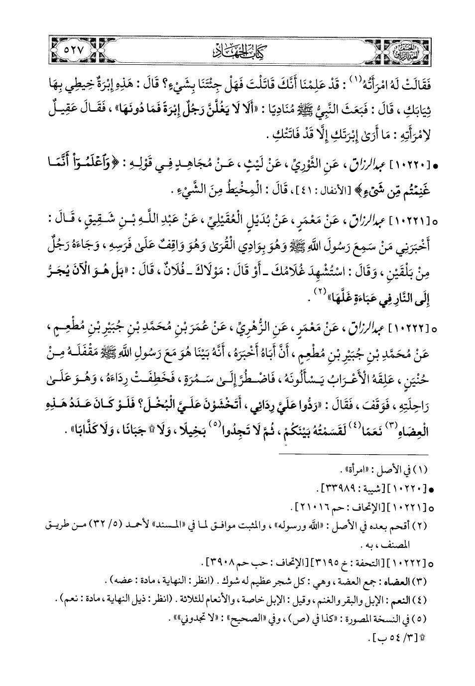 10222 - عبد الرزاق، عَنْ مَعْمَرٍ، عَنِ الزُّهْرِيِّ، عَن عُمَرَ بْنِ مُحَمَّدِ بْنِ جُبَيرِ بْنِ مُطْعَمٍ، عَن مُحَمَّدِ بْنِ جُبَيرِ بْنِ مُطْعَمٍ، أَنَّ أَبَاهُ أَخْبَرَهُ، أَنَّهُ بَيْنَا هُوَ مَعَ رَسُولِ اللهِ صَلَّى اللهُ عَلَيْهِ وَسَلَّمَ مَقْفَلُهُ مِنْ حُنَيْنَ عَلِقَهُ الأَعْرَابُ يَسْأَلُونَهُ، فَاضْطُرَّ إِلَى سَمُرَةٍ فَخَطِفَتْ رِدَاءَهُ وَهُوَ عَلَى رَاحِلَتِهِ، فَوَقَفَ فَقَالَ: رُدُّوا عَلَيَّ رِدَائِي، أَتَخْشَوْنَ عَلَيَّ الْبُخْلَ؟ فَلَوْ كَانَ عَدَدُ هَذِهِ الْعِضَاهِ نَعَمًا لَقَسَمْتُهُ بَيْنَكُمْ، ثُمَّ لاَ تَجِدُوني (1) بَخِيلاً، وَلاَ جَبَانًا، وَلاَ كَذَّابًا.