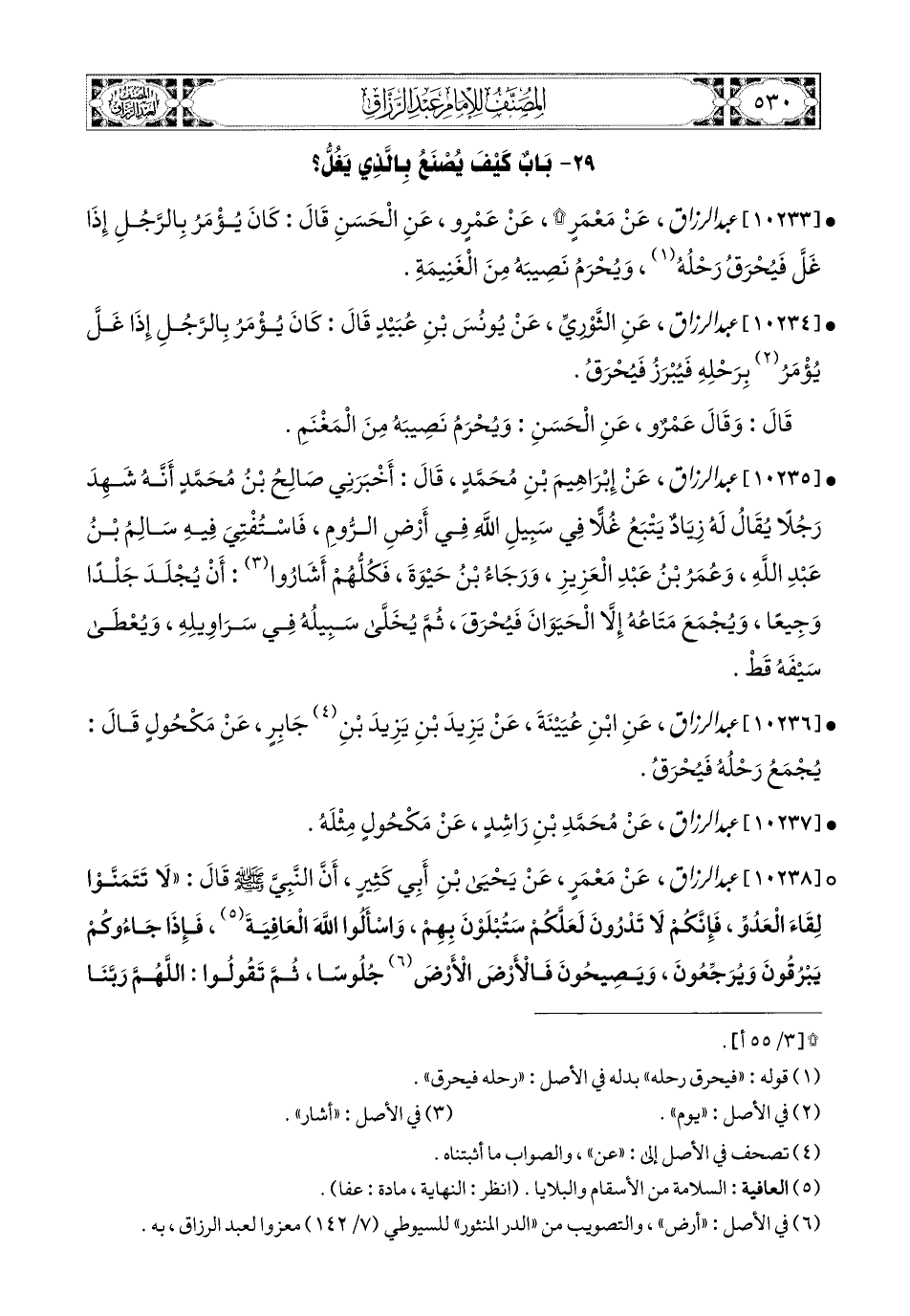 10233- عبد الرزاق، عَنْ مَعْمَرٍ، عَنْ عَمْرٍو، عَنِ الْحَسَنِ قَالَ: كَانَ يُؤْمَرُ بِالرَّجُلِ إِذَا غَلَّ فَيُحَرَّقُ رَحْلُهُ، وَيُحْرَمُ نَصِيبَهُ مِنَ الْغَنِيمَةِ.