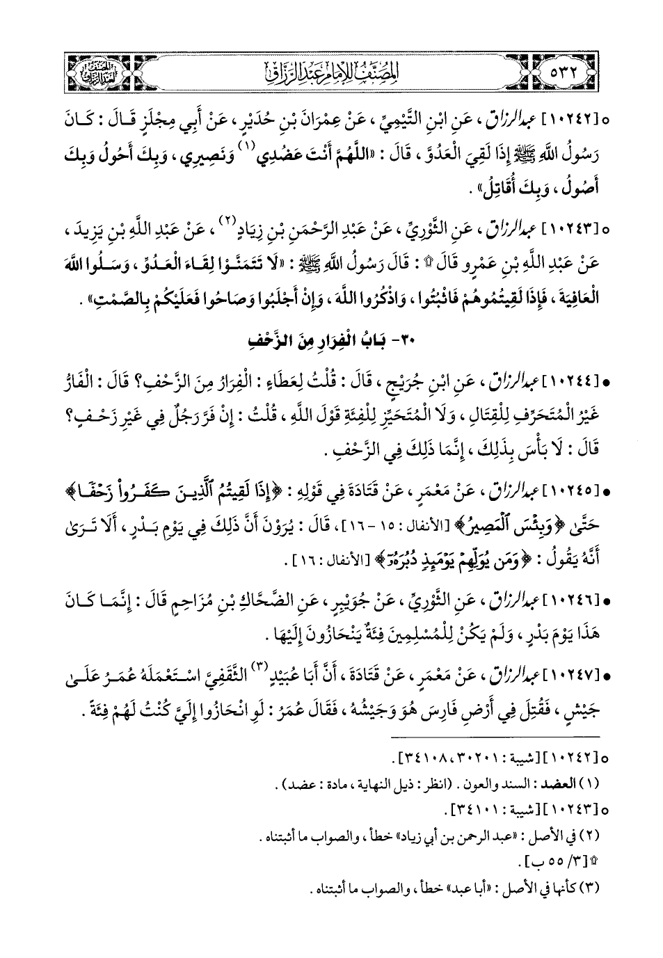 10244- عبد الرزاق، عَنِ ابْنِ جُرَيْجٍ، قَالَ: قُلْتُ لِعَطَاءٍ: الْفِرَارُ مِنَ الزَّحْفِ؟ قَالَ: الْفَارُّ غَيْرُ المُتَحَرِّفِ لِلْقِتَالِ، وَلاَ المُتَحَيِّزُ لِلْفِئَةِ قَوْلَ اللهِ، قُلْتُ: إِنْ فَرَّ رَجُلٌ فِي غَيْرِ زَحْفٍ؟ قَالَ: لاَ بَأْسَ بِذَلِكَ، إِنَّمَا ذَلِكَ فِي الزَّحْفِ.