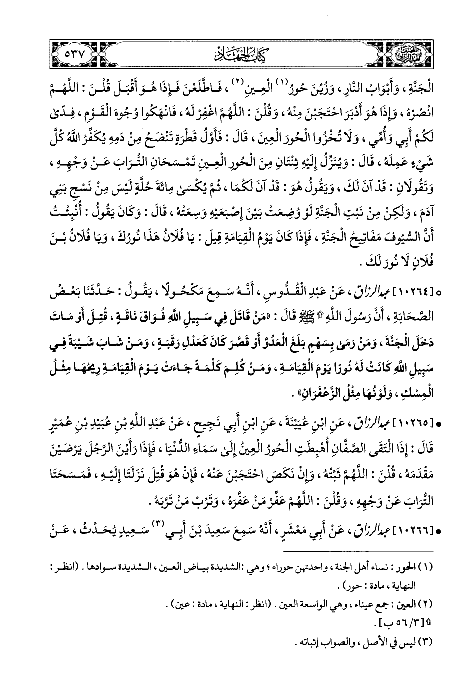 10265- عبد الرزاق، عَنِ ابْنِ عُيَيْنَةَ، عَنِ ابْنِ أَبِي نَجِيحٍ، عَنْ عَبدِ اللهِ بْنِ عُبَيْدِ بْنِ عُمَيْرٍ قَالَ: إِذَا الْتَقَى الصَّفَانِ أُهْبِطَتِ الْحُورُ الْعِينُ إِلَى سَمَاءِ الدُّنْيَا، فَإِذَا رَأَيْنَ الرَّجُلَ يَرْضَيْنَ مَقْدِمَهُ، قُلْنَ: اللهُمَّ ثَبِّتْهُ، وَإِنْ نَكَصَ احْتَجَبْنَ عَنْهُ، فَإِنْ هُوَ قُتِلَ نَزَلَتَا إِلَيْهِ، فَمَسَحَتَا التُّرَابَ عَن وَجْهِهِ، وَقُلْنَ: اللهُمَّ عَفِّرْ مَنْ عَفَّرَهُ، وَتَرِّبْ مَنْ تَرَّبَهُ.