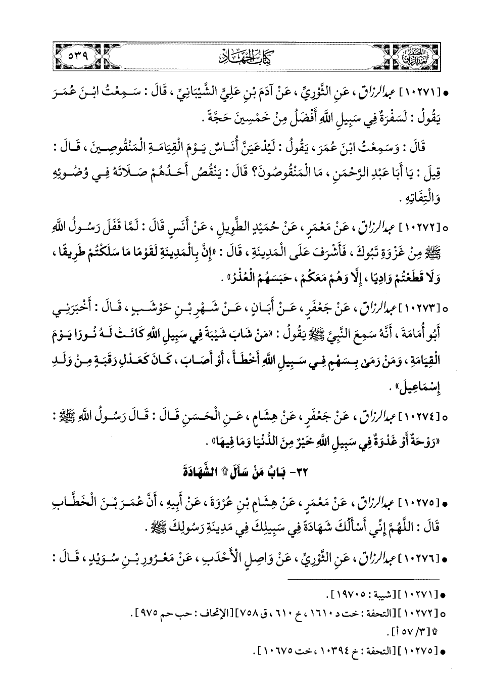 10275- عبد الرزاق، عَنْ مَعْمَرٍ، عَن هِشَامِ بْنِ عُرْوَةَ، عَنْ أَبِيهِ، أَنَّ عُمَرَ بن الْخَطَّابِ قَالَ: اللهُمَّ إِنِّي أَسْأَلُكَ شَهَادَةً فِي سَبِيلِكَ، فِي مَدِينَةِ رَسُولِكَ صَلَّى اللهُ عَلَيْهِ وَسَلَّمَ.