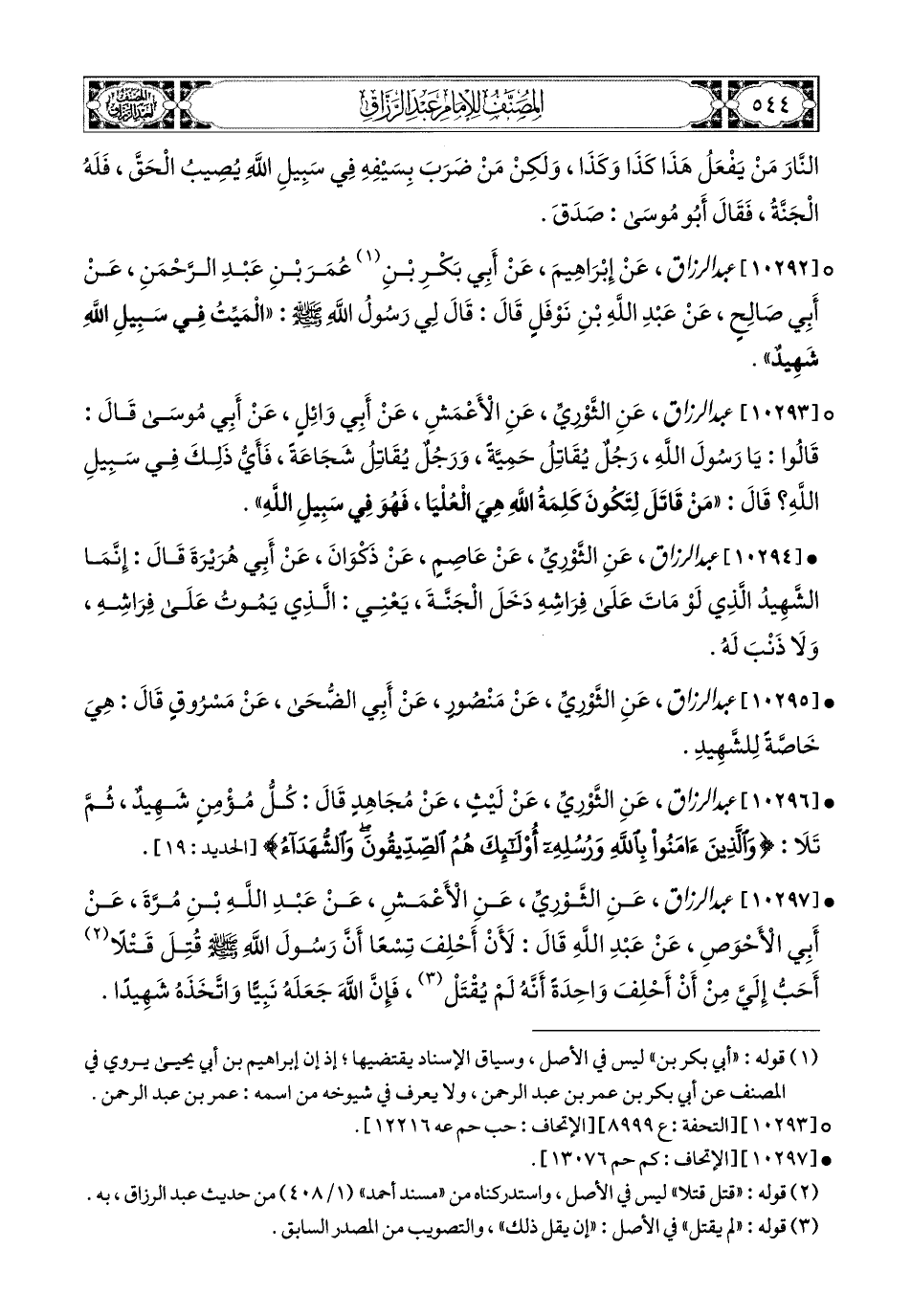 10294- عبد الرزاق، عَنِ الثَّورِيِّ، عَنْ عَاصِمٍ، عَن ذَكْوَانَ، عَنْ أَبِي هُرَيرَةَ، قَالَ: إِنَّمَا الشَّهِيدُ الَّذِي لَوْ مَاتَ عَلَى فِرَاشِهِ دَخَلَ الْجَنَّةَ، يَعْنِي الَّذِي يَمُوتُ عَلَى فِرَاشِهِ، وَلاَ ذَنْبَ لَهُ.