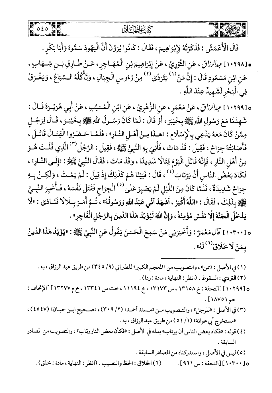 10299- عبد الرزاق، عَنْ مَعْمَرٍ، عَنِ الزُّهْرِيِّ، عَنِ ابْنِ المُسَيَّبِ، عَنْ أَبِي هُرَيرَةَ، قَالَ: شَهِدْنَا مَعَ رَسُولِ اللهِ صَلَّى اللهُ عَلَيْهِ وَسَلَّمَ بِخَيْبَرَ، أَوْ قَالَ: لَمَّا كَانَ رَسُولُ اللهِ صَلَّى اللهُ عَلَيْهِ وَسَلَّمَ بِخَيْبَرِ، قَالَ لِرَجُلٍ مِمَّنْ كَانَ مَعَهُ يَدَّعِي بالإِسْلاَم (1): هَذَا مِنْ أَهْلِ النَّارِ، فَلَمَّا حَضَرُوا الْقِتَالُ قَاتَلَ، فَأَصَابَتْهُ جِرَاحٌ، فَقِيلَ: قَدْ مَاتَ، فَأُتِيَ بِهِ النَّبِيُّ صَلَّى اللهُ عَلَيْهِ وَسَلَّمَ، فَقِيلَ: الرَّجُلُ الَّذِي قُلْتَ: هُوَ مِنْ أَهْلِ النَّارِ، فَإِنَّهُ قَاتَلَ الْيَوْمَ قِتَالاً شَدِيدًا، وَقَدْ مَاتَ، فَقَالَ النَّبِيُّ صَلَّى اللهُ عَلَيْهِ وَسَلَّمَ: إِلَى النَّارِ، فَكَادَ بَعْضُ النَّاسِ أَنْ يَرْتَابَ، قَالَ: فَبَيْنَا هُمْ كَذَلِكَ، إِذْ قِيلَ: لَمْ يَمُتْ، وَلَكِنْ بِهِ جِرَاحٌ شَدِيدَةٌ، فَلَمَّا كَانَ من اللَّيْلُ، لَمْ يَصْبِرْ عَلَى الْجِرَاحِ، فَقَتَلَ نَفْسَهُ، فَأُخْبِرَ النَّبِيُّ صَلَّى اللهُ عَلَيْهِ وَسَلَّمَ بِذَلِكَ، فَقَالَ: اللهُ أَكْبَرُ، أَشْهَدُ أَنِّي عَبدُ اللهِ وَرَسُولُهُ، ثُمَّ أَمَرَ بِلاَلاً فَنَادَى: لاَ يَدْخُلُ الْجَنَّةَ إِلاَّ نَفْسٌ مُؤْمِنَةٌ، وَإِنَّ اللهَ لَيُؤَيِّدُ هَذَا الدِّينَ بِالرَّجُلِ الْفَاجِرِ.