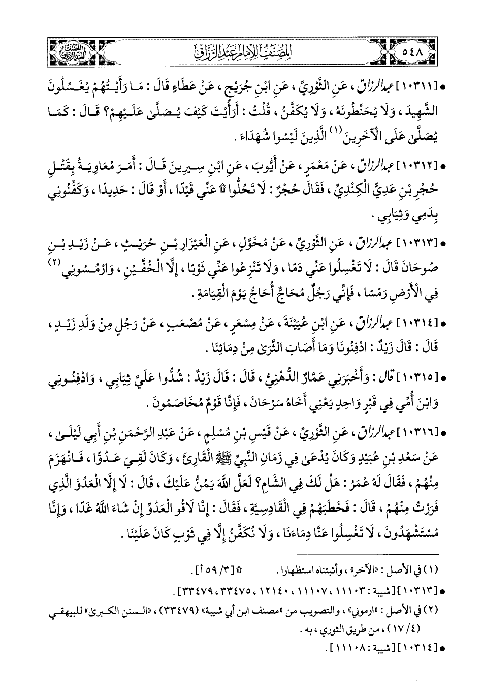 10316- عبد الرزاق، عَنِ الثَّورِيِّ، عَن قَيْسِ بْنِ مُسْلِمٍ، عَنْ عَبدِ الرَّحْمَنِ بْنِ أَبِي لَيْلَى، عَن سَعْدِ بْنِ عُبَيدٍ، وَكَانَ يُدْعَى فِي زَمَانِ النَّبِيِّ صَلَّى اللهُ عَلَيْهِ وَسَلَّمَ: الْقَارِئُ، وَكَانَ لَقِيَ عَدُوًّا، فَانْهَزَمَ مِنْهُمْ، فَقَالَ لَهُ عُمَرُ: هَلْ لَكَ فِي الشَّامِ؟ لَعَلَّ اللهَ يَمُنُّ عَلَيْكَ، قَالَ: لاَ، إِلاَّ الْعَدُوَّ الَّذِي فَرَرْتُ مِنْهُمْ، قَالَ: فَخَطَبَهُمْ فِي الْقَادِسِيَّةِ، فَقَالَ: إِنَّا لاَقُو الْعَدُوِّ إِنْ شَاءَ اللهُ غَدًا، وَإِنَّا مُسْتَشْهِدُونَ، لاَ تَغْسِلُوا عَنَّا دِمَاءَنَا، وَلاَ نُكَفَّنُ إِلاَّ فِي ثَوْبٍ كَانَ عَلَيْنَا.