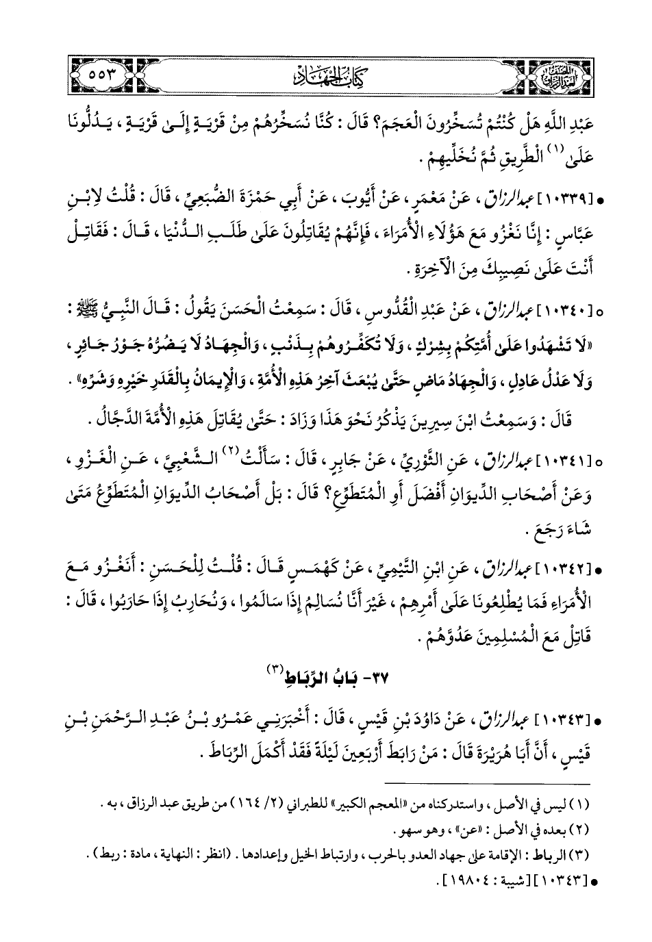 10340- عبد الرزاق، عَنْ عَبدِ الْقُدُّوسِ، قَالَ: سَمِعْتُ الْحَسَنَ يَقُولُ: قَالَ النَّبِيُّ صَلَّى اللهُ عَلَيْهِ وَسَلَّمَ: لاَ تَشْهَدُوا عَلَى أُمَّتِكُمْ بِشْرِكٍ، وَلاَ تُكَفِّرُوهُمْ بِذَنْبٍ، وَالْجِهَادُ لاَ يَضُرُّهُ جَوْرُ جَائِرٍ، وَلاَ عَدْلُ عَادِلٍ، وَالْجِهَادُ مَاضٍ حَتَّى يُبْعَثَ آخِرُ هَذِهِ الأُمَّةِ، وَالإِيمَانُ بِالْقَدَرِ خَيْرِهِ وَشَرِّهِ، قَالَ: وَسَمِعْتُ ابْنَ سِيرِينَ يَذْكُرُ نَحْوَ هَذَا، وَزَادَ: حَتَّى يُقَاتِلَ هَذِهِ الأُمَّةَ الدَّجَّالُ.