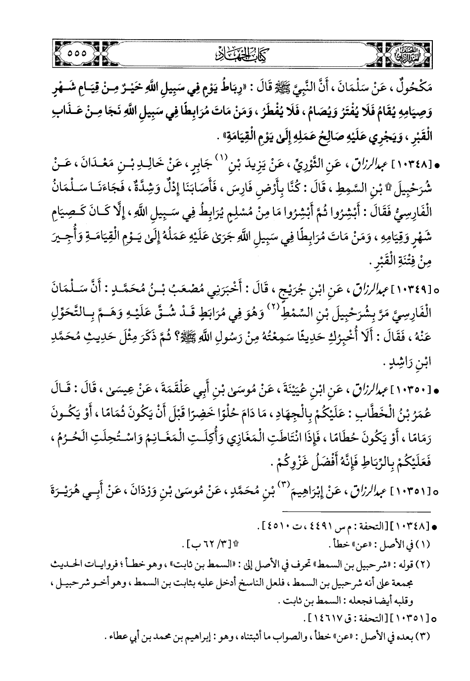 10349 - عبد الرزاق، عَنِ ابْنِ جُرَيْجٍ، قَالَ: أَخْبَرَنِي مُصْعَبُ بن مُحَمَّدٍ؛ أَنَّ سَلْمَانَ الْفَارِسِيَّ مَرَّ بِشُرَحْبِيلَ بْنِ السِّمْطِ (1) وَهُوَ فِي مُرَابِطٍ قَدْ شُقَّ عَلَيْهِ وَهَمَّ بِالتَّحَوْلِ عَنْهُ، فَقَالَ: أَلاَ أُخْبَرُكَ حَدِيثًا سَمِعْتُهُ مِنْ رَسُولِ اللهِ صَلَّى اللهُ عَلَيْهِ وَسَلَّمَ؟ ثُمَّ ذَكَرَ مِثْلَ حَدِيثِ مُحَمَّدِ بْنِ رَاشِدٍ.