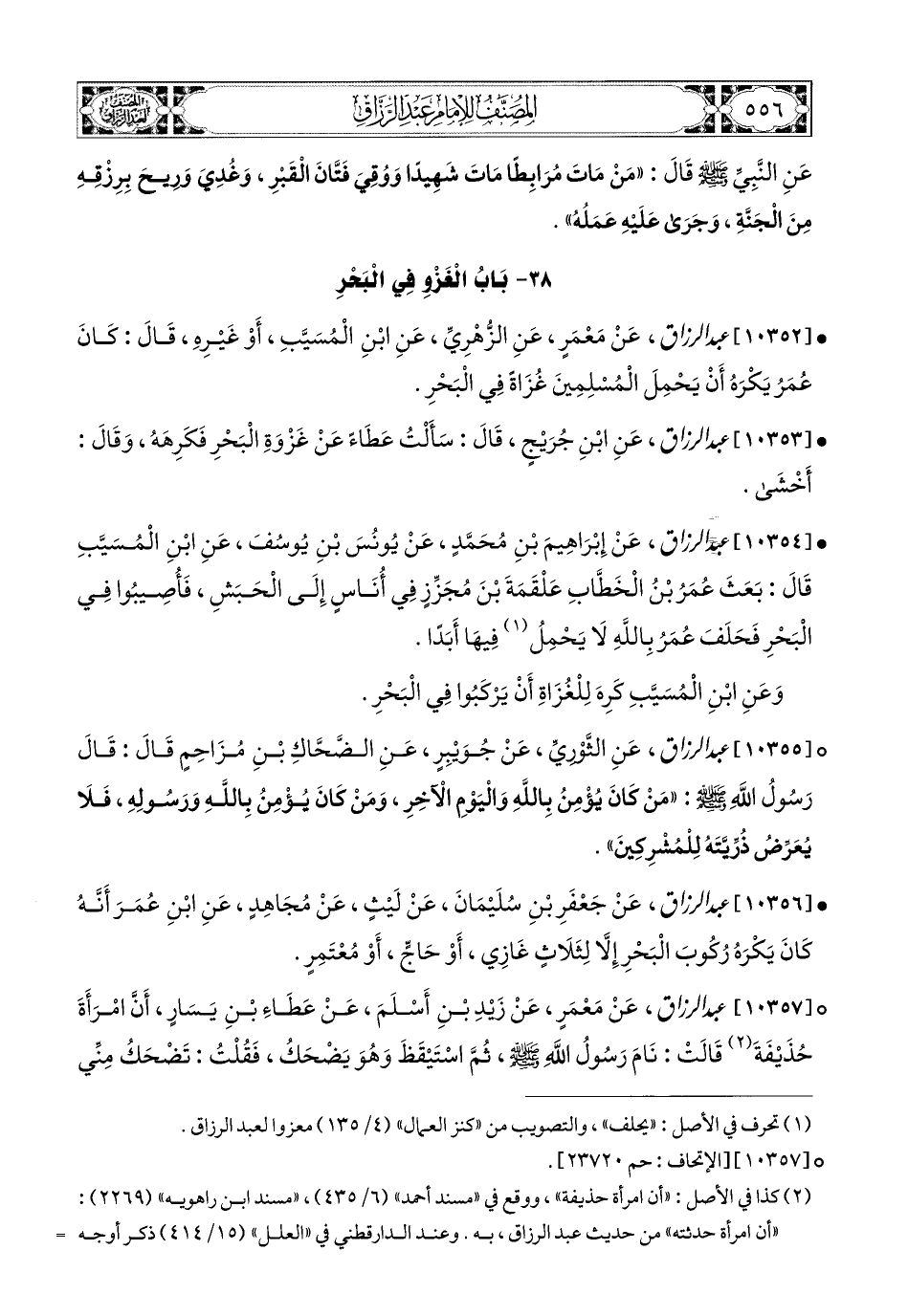 10352- عبد الرزاق، عَنْ مَعْمَرٍ، عَنِ الزُّهْرِيِّ، عَنِ ابْنِ المُسَيَّبِ، أَوْ غَيْرِهِ قَالَ: كَانَ عُمَرُ يَكْرَهُ أَنْ يَحْمِلُ المُسْلِمِينَ غُزَاةً فِي الْبَحْرِ.