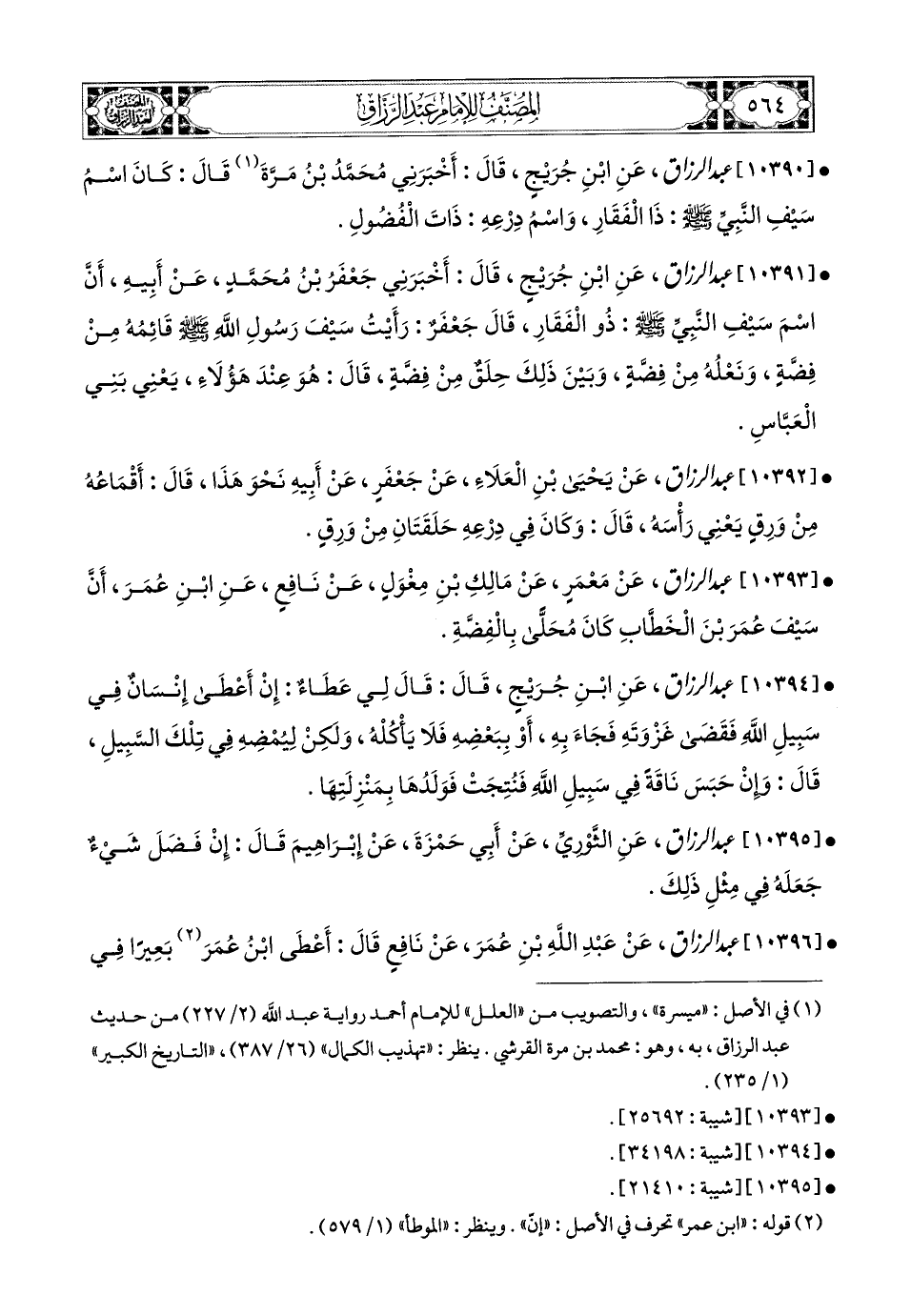 10391- عبد الرزاق، عَنِ ابْنِ جُرَيْجٍ، قَالَ: أَخْبَرَنِي جَعْفَرُ بن مُحَمَّدٍ، عَنْ أَبِيهِ؛ أَنَّ اسْمَ سَيْفِ النَّبِيِّ صَلَّى اللهُ عَلَيْهِ وَسَلَّمَ: ذُو الْفَقَارِ، قَالَ جَعْفَرٌ: رَأَيْتُ سَيْفَ رَسُولِ اللهِ صَلَّى اللهُ عَلَيْهِ وَسَلَّمَ قَائِمُهُ مِنْ فِضَّةٍ، وَنَعْلُهُ مِنْ فِضَّةٍ، وَبَيْنَ ذَلِكَ حِلَقٌ مِنْ فِضَّةٍ، قَالَ: هُوَ عِنْدَ هَؤُلاَءِ، يَعْنِي بَنِي الْعَبَّاسِ.