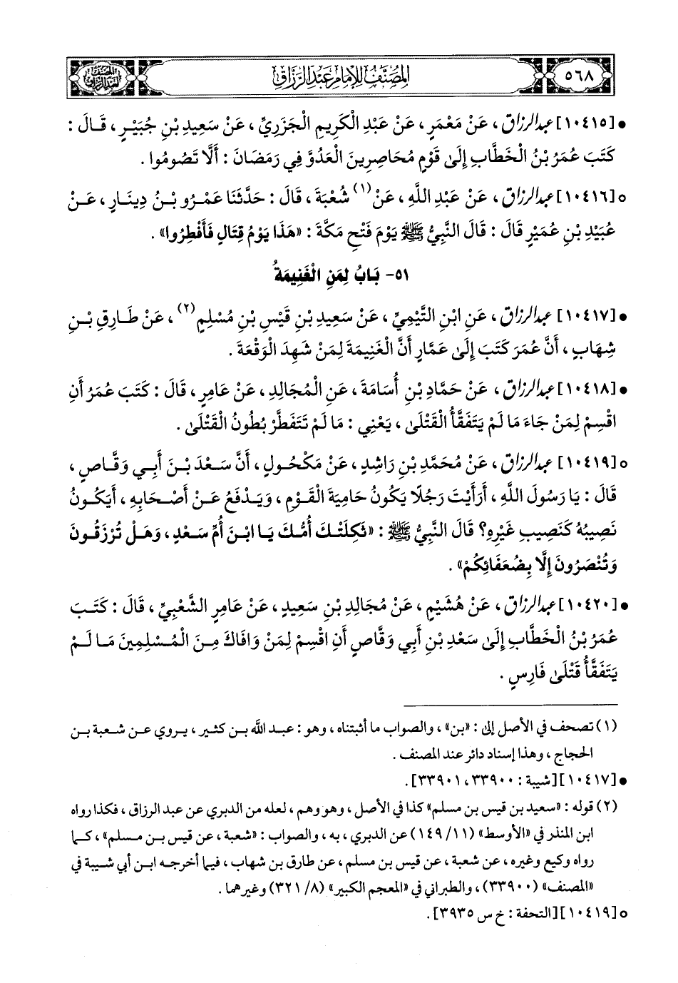 10417 - عبد الرزاق، عَنِ ابْنِ التَّيْمِيِّ، عَن شعبة، عَن قَيْسِ بْنِ مُسْلِمٍ (1)، عَن طَارِقِ بْنِ شِهَابٍ، أَنَّ عُمَرَ كَتَبَ إِلَى عَمَّارٍ؛ أَنَّ الْغَنِيمَةَ لِمَنْ شَهِدَ الْوَقْعَةَ.