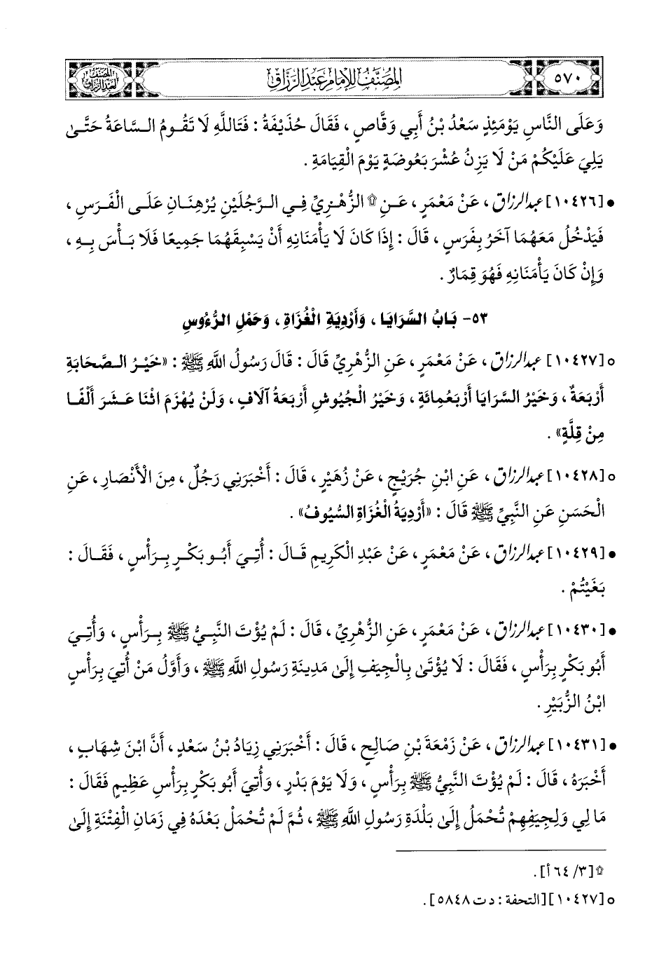 10431- عبد الرزاق، عَن زَمْعَةَ بْنِ صَالِحٍ، قَالَ: أَخْبَرَنِي زِيَادُ بن سَعْدٍ، أَنَّ ابْنَ شِهَابٍ أَخْبَرَهُ، قَالَ: لَمْ يُؤْتَ النَّبِيُّ صَلَّى اللهُ عَلَيْهِ وَسَلَّمَ بِرَأْسٍ، وَلاَ يَوْمَ بَدْرٍ، وَأُتِيَ أَبو بَكْرٍ بِرَأْسٍ عَظِيمٍ، فَقَالَ: مَا لِي وَلِجِيَفِهِمْ تُحْمَلُ إِلَى بَلْدَةِ رَسُولِ اللهِ صَلَّى اللهُ عَلَيْهِ وَسَلَّمَ، ثُمَّ لَمْ تُحْمَلْ بَعْدَهُ فِي زَمَانِ الْفِتْنَةِ إِلَى مَرْوَانَ وَلاَ إِلَى غَيْرِهِ، حَتَّى كَانَ زَمَانُ ابْنِ الزُّبَيْرِ، فَهُوَ أَوَّلُ مَنْ سَنَّ ذَلِكَ، حُمِلَ إِلَيْهِ رَأْسُ زِيَادٍ وَأَصْحَابِهِ، وَطَبَخُوا رُؤُوسَهُمْ فِي الْقُدُورِ.