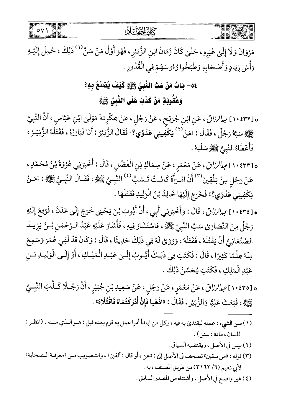 10434- عبد الرزاق، قَالَ: وَأَخْبَرَنِي أَبِي؛ أَنَّ أَيُّوبَ بن يَحيَى خَرَجَ إِلَى عَدَنٍ، فَرُفِعَ إِلَيْهِ رَجُلٌ مِنَ النَّصَارَى سَبَّ النَّبِيَّ صَلَّى اللهُ عَلَيْهِ وَسَلَّمَ، فَاسْتَشَارَ فِيهِ، فَأَشَارَ عَلَيْهِ عَبدُ الرَّحْمَنِ بن يَزِيدَ الصَّنَعَانِيُّ أَنْ يَقْتُلَهُ، فَقَتَلَهُ، وَرَوَى لَهُ فِي ذَلِكَ حَدِيثًا قَالَ: وَكَانَ قَدْ لَقِيَ عُمَرَ، وَسَمِعَ مِنْهُ عِلْمًا كَثِيرًا، قَالَ: فَكَتَبَ فِي ذَلِكَ أَيُّوبُ إِلَى عَبدِ المَلِكِ، أَوْ إِلَى الْوَلِيدِ بْنِ عَبدِ المَلِكِ، فَكَتَبَ يُحَسِّنُ ذَلِكَ.