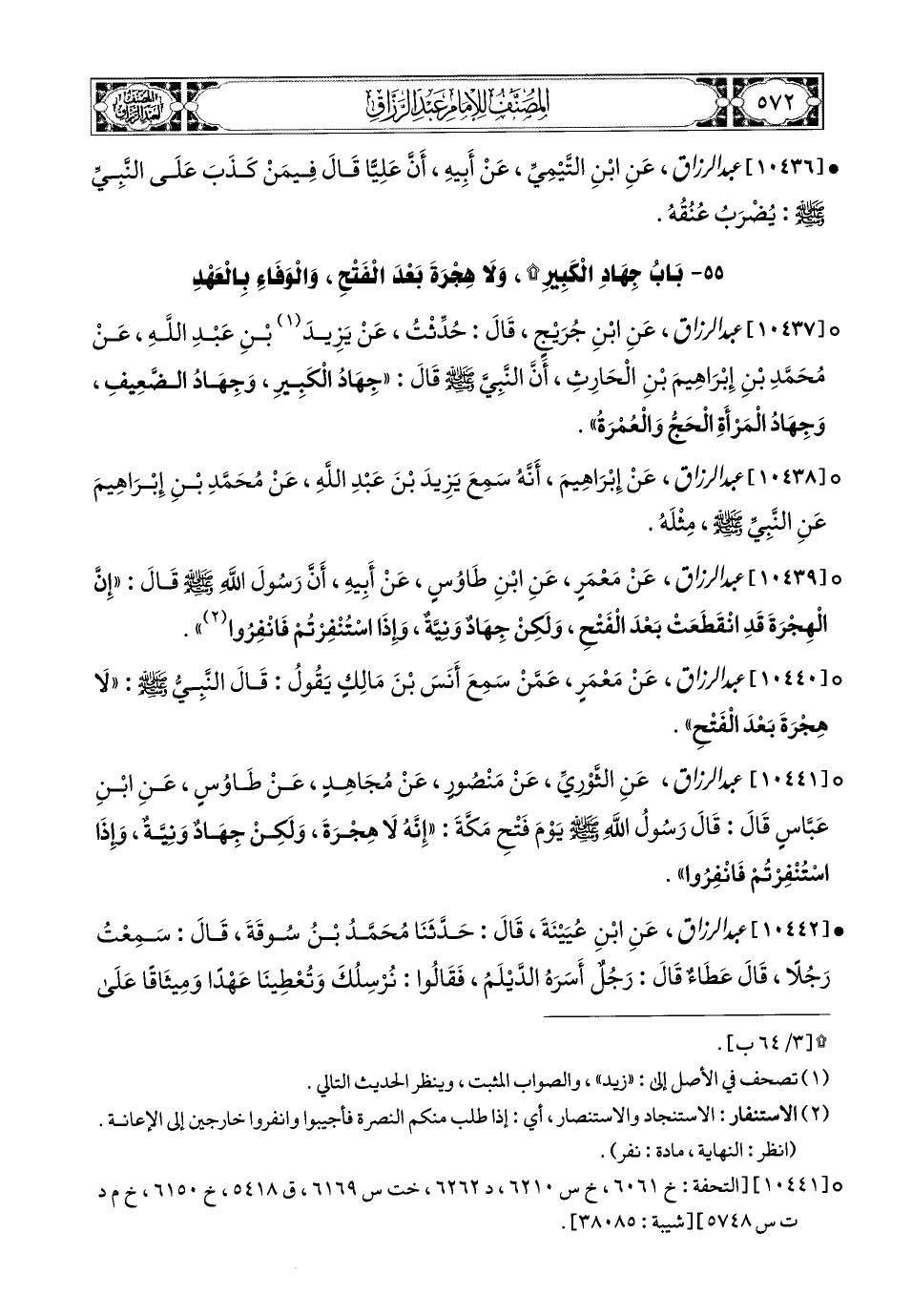 10440- عبد الرزاق، عَنْ مَعْمَرٍ، عَمَّنْ سَمِعَ أَنَسَ بن مَالِكٍ يَقُولُ: قَالَ النَّبِيُّ صَلَّى اللهُ عَلَيْهِ وَسَلَّمَ: لاَ هِجْرَةَ بَعْدَ الْفَتْحِ.
