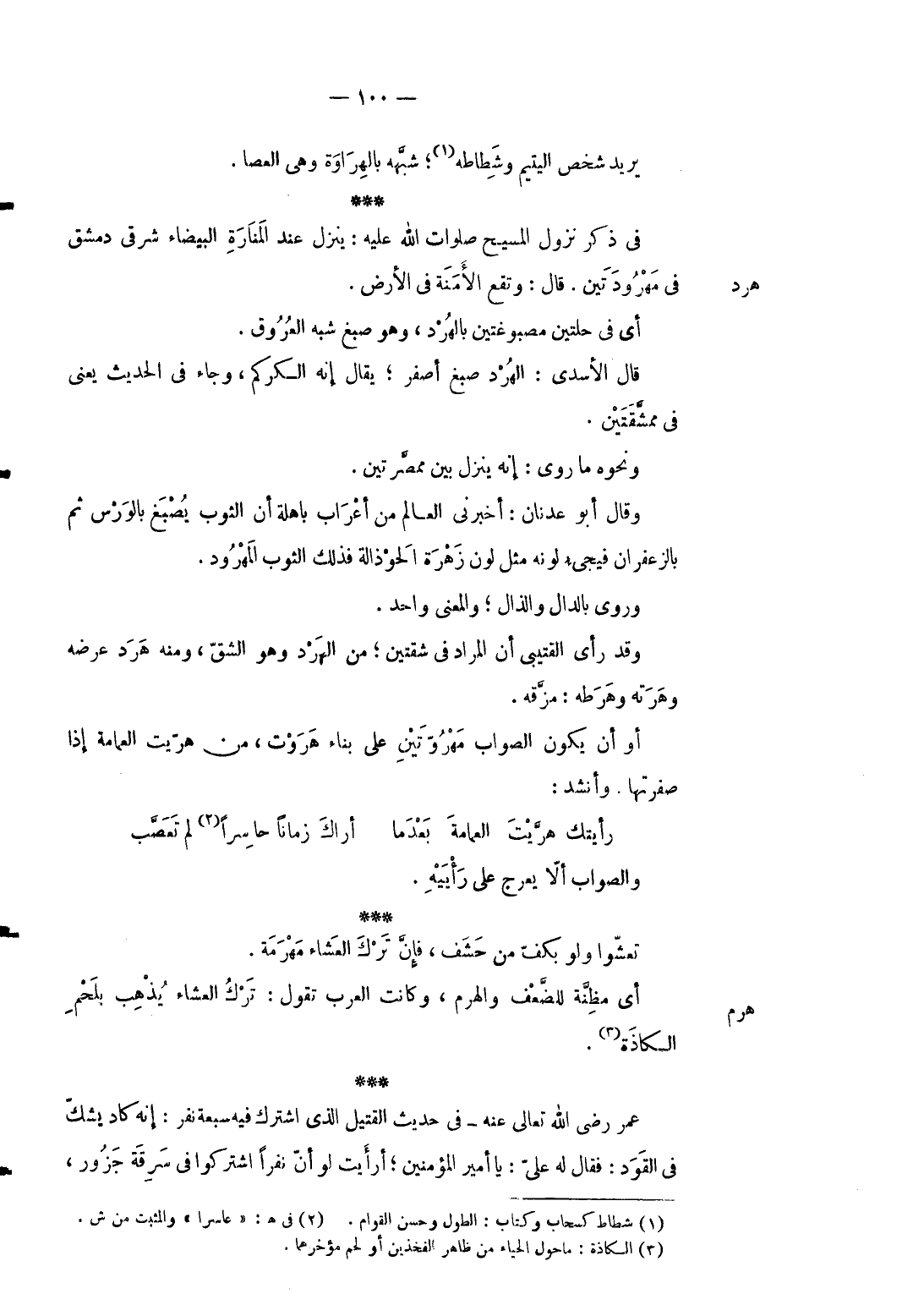 هرد فِي ذكر نزُول الْمَسِيح صلوَات الله عَلَيْهِ: ينزل عِنْد المنارة الْبَيْضَاء شَرْقي دمشق فِي مهرودتين. قَالَ: وَتَقَع الأمنة فِي الأَرْض. أَي فِي حلتين مصبوغتين بالهرد وَهُوَ صبغ شبه الْعُرُوق. قَالَ الْأَسدي: الهرد صبغ أصفر يُقَال إِنَّه الكركم وَجَاء فِي الحَدِيث يَعْنِي فِي ممشقتين. وَنَحْوه ماروى: إِنَّه ينزل بَين مُمَصَّرَتَيْنِ. وَقَالَ أَبُو عدنان: أَخْبرنِي الْعَالم من أَعْرَاب باهلة أَن الثَّوْب يصْبغ بالورس ثمَّ بالزعفران فيجئ لَونه مثل لون زهرَة الحوذالة فَذَلِك الثَّوْب المهرود. وروى بِالدَّال والذال وَالْمعْنَى وَاحِد. وَقد رأى القتيبي أَن المُرَاد فِي شقتين من الهرد وَهُوَ الشق وَمِنْه هرد عرضه وهرته وهرطه: مزَّقه. أَو أَن يكون الصَّوَاب مهروتين على بِنَاء هروت من هرّيت الْعِمَامَة إِذا صفرتها. وَأنْشد: ... رَأَيْتُك هرَّيْتَ العمامةَ بَعْدَما ... أراكَ زَمَانا حاسِراً لم تَعَصَّب ... وَالصَّوَاب أَلا يعرج على رأييه.