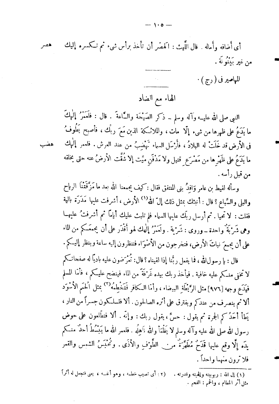 هضب النَّبِي صلى الله عَلَيْهِ وَآله وَسلم ذكر الصَّيْحَة والساعة. قَالَ: فلعمر إلهك مَا يدع على ظهرهَا من شئ إِلَّا مَاتَ وَالْمَلَائِكَة الَّذين مَعَ رَبك فَأصْبح يطوف فِي الأَرْض قد خلت لَهُ الْبِلَاد فَأرْسل السَّمَاء تهضب من عِنْد الْعَرْش. فلعمر إلهك مَا يدع على ظهرهَا من مصرع قَتِيل وَلَا مدفن ميت إِلَّا شقَّت الأَرْض عَنهُ حَتَّى يخلقه من قبل رَأسه. وَسَأَلَهُ لَقِيط بن عَامر وَافد بني المنتفق فَقَالَ: كَيفَ يجمعنا الله بعد مَا مزقتنا الرِّيَاح والبلى وَالسِّبَاع قَالَ: أنبئك بِمثل ذَلِك إل الله الأَرْض أشرفت عَلَيْهَا مَدَرَة بالية فَقلت: لَا تحيا. ثمَّ أرسل رَبك عَلَيْهَا السَّمَاء فَلم تلبث عَلَيْك أَيَّامًا ثمَّ أشرفت عَلَيْهَا وَهِي شربة وَاحِدَة وروى: شربة. ولعمر إلهك لَهو أقدر على أَن يجمعكم من المَاء على أَن يجمع نَبَات الأَرْض فتخروجون من الأصواء فنتظرون إِلَيْهِ سَاعَة وَينظر إِلَيْكُم. قَالَ: يَا رَسُول الله فَمَا يفعل ربُّنا إِذا لقيناه قَالَ: تُعرضون عَلَيْهِ بادياً لَهُ صفحاتكم لَا تخفى مِنْكُم عَلَيْهِ خافية. فَيَأْخُذ رَبك بِيَدِهِ غرفَة من المَاء فينضح عَلَيْكُم فَأَما الْمُسلم فيدع وَجهه [976] مثل الريطة الْبَيْضَاء وَأما الْكَافِر فتخطمهبمثل الحمم الْأسود أَلا ثمَّ ينْصَرف من عنْدكُمْ ويفترق على أَثَره الصالحون. أَلا فتسلكون جِسْرًا من النَّار يطَأ أحدكُم الْجَمْرَة ثمَّ يَقُول: حسِّ يَقُول رَبك: وَإنَّهُ. أَلا فتطّلعون على حَوْض رَسُول الله صلى الله عَلَيْهِ وَآله وَسلم لَا يظمأ وَالله ناهله. فلعمر الله مَا يبسط أحد مِنْكُم يَده إِلَّا وَقع عَلَيْهَا قدحٌ مطهَّرة من الطَّوف والأذى. وتُحبس الشَّمْس وَالْقَمَر فَلَا ترَوْنَ مِنْهُمَا وَاحِدًا.