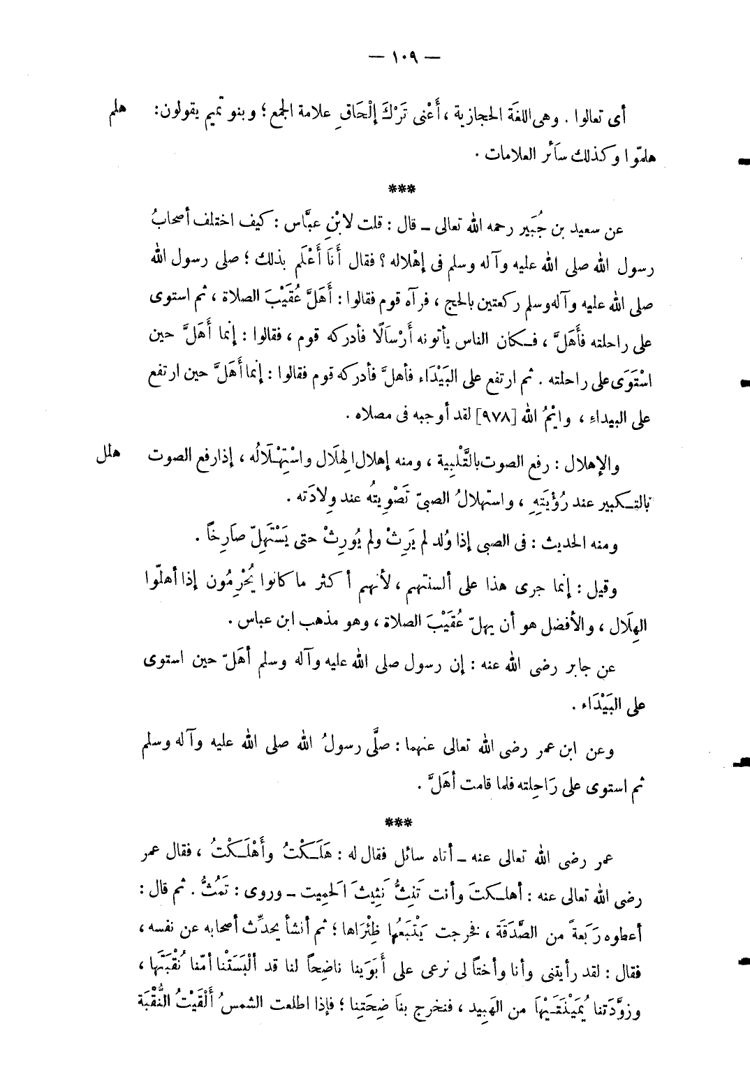 هلل عَن سعيد بن جُبَير رَحْمَة الله تَعَالَى قَالَ: قلت لِابْنِ عَبَّاس: كَيفَ اخْتلف أَصْحَاب رَسُول الله صلى الله عَلَيْهِ وَآله وَسلم فِي إهلاله فَقَالَ أَنا أعلم بذلك صلى رَسُول الله صلى الله عَلَيْهِ وَآله وَسلم رَكْعَتَيْنِ بِالْحَجِّ فَرَآهُ قوم فَقَالُوا: أهل عقيب الصَّلَاة ثمَّ اسْتَوَى على رَاحِلَته فَأهل فَكَانَ النَّاس يأتونه أَرْسَالًا فأدركه قوم فَقَالُوا: إِنَّمَا أهل حِين اسْتَوَى على رَاحِلَته ثمَّ ارْتَفع على الْبَيْدَاء فَأهل فأدركه قوم فَقَالُوا: إِنَّمَا أهل حِين ارْتَفع على الْبَيْدَاء وأيم الله] 978 [لقد أوجبه فِي مصلاة والإهلال: رفع الصَّوْت بِالتَّلْبِيَةِ وَمِنْه إهلال الْهلَال واستهلاله إِذا رفع الصَّوْت بِالتَّكْبِيرِ عِنْد رُؤْيَته واستهلال الصبى تصويته عِنْد وِلَادَته وَمِنْه الحَدِيث: فِي الصبى إِذا ولد لم يَرث وَلم يُورث حَتَّى يستهل صَارِخًا وَقيل: إِنَّمَا جرى هَذَا على ألسنتهم لأَنهم أَكثر مَا كَانُوا يحرمُونَ إِذا أهلوا الْهلَال وَالْأَفْضَل هُوَ أَن يهل عقيب الصَّلَاة وَهُوَ مَذْهَب ابْن عَبَّاس عَن جَابر رَضِي الله عَنهُ: إِن رَسُول الله صلى الله عَلَيْهِ وَآله وَسلم أهل حِين اسْتَوَى على الْبَيْدَاء وَعَن ابْن عمر رضى الله تَعَالَى عَنْهُمَا: صلى رَسُول الله صلى الله عَلَيْهِ وَآله وَسلم ثمَّ اسْتَوَى على رَاحِلَته فَلَمَّا قَامَت أهل