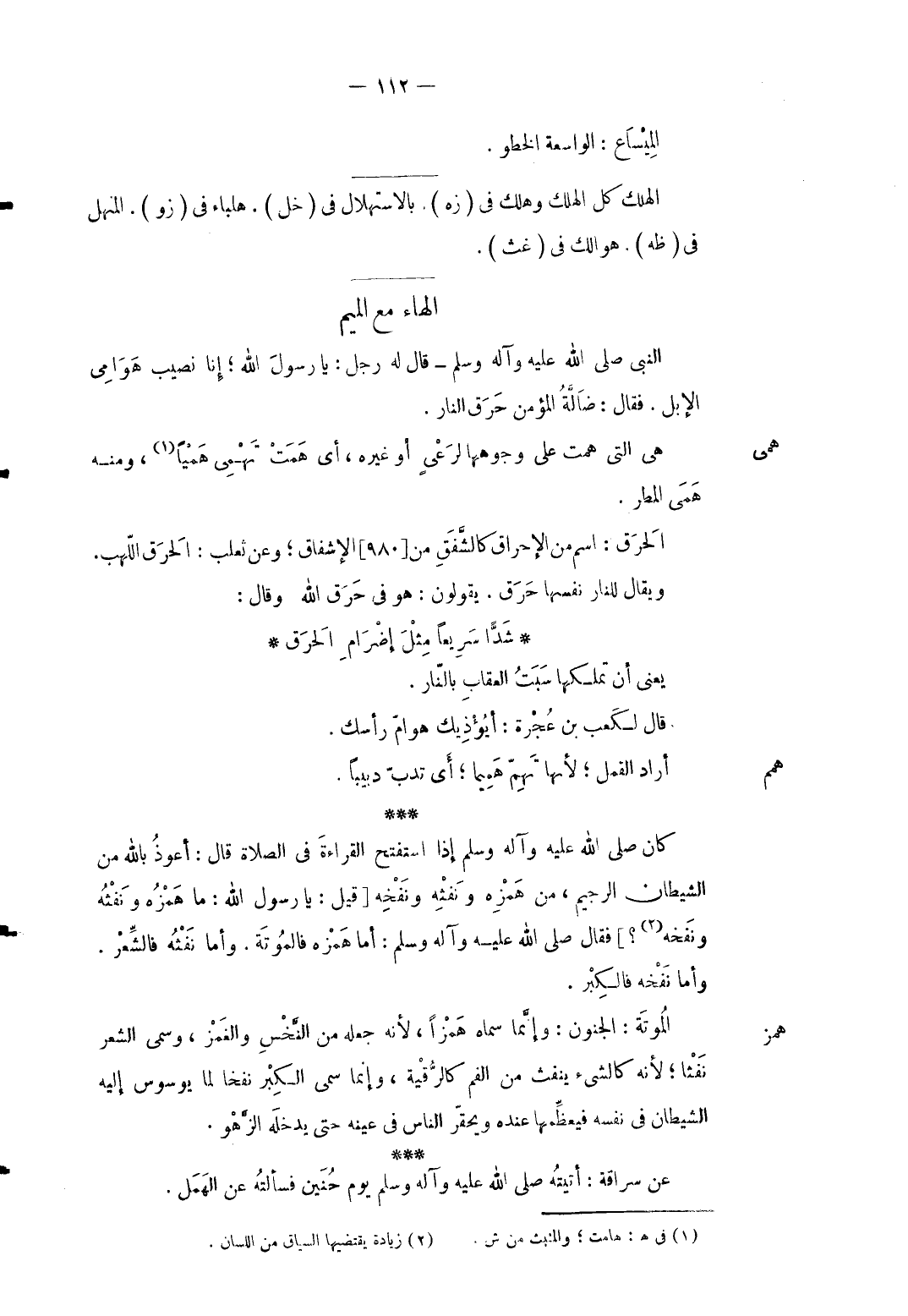 همز كَانَ صلى الله عَلَيْهِ وَآله وَسلم إِذا استفتح الْقِرَاءَة فِي الصَّلَاة قَالَ: أعوذ بِاللَّه من الشَّيْطَان الرَّجِيم من همزه ونفثه ونفخه] قيل: يَا رَسُول الله: مَا همزه ونفثه ونفخه [فَقَالَ صلى الله عَلَيْهِ وَآله وَسلم: أما همزه فالموتة وَأما نفثه فالشِّعر وَأما نفخه فالكِبر الموتة: الْجُنُون: وَإِنَّمَا سَمَّاهُ همزاً لِأَنَّهُ جعله من النَّخس والغمز وسمى الشّعْر نفثا لِأَنَّهُ كالشيء ينفث من الْفَم كالرقية وَإِنَّمَا سمى الْكبر نفخا لم يوسوس إِلَيْهِ الشَّيْطَان فِي نَفسه فيعظمها عِنْده ويحقّر النَّاس فِي عينه حَتَّى يدْخلهُ الزهو