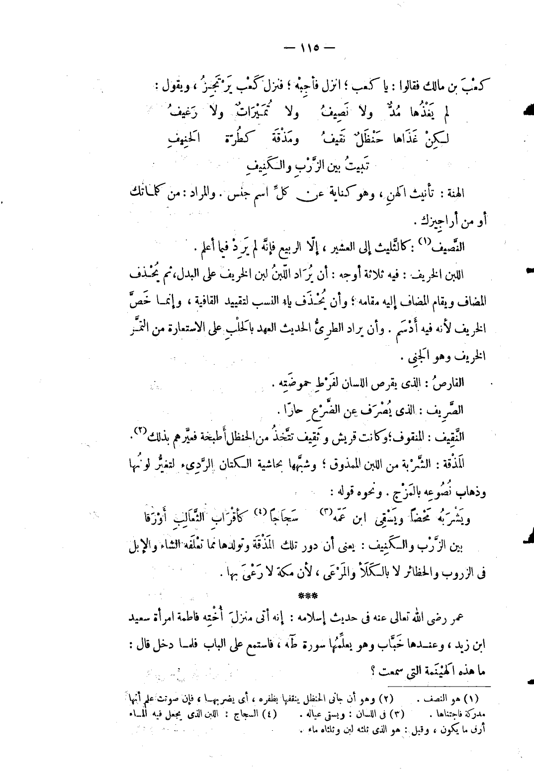 تَبيتُ بَين الزَّرْبِ والكَنِيفِ ... الهنة: تَأْنِيث الهن وَهُوَ كِنَايَة عَن كل اسْم جنس وَالْمرَاد: من كلماتك أومن أراجيزك النصيف: كالثليث إِلَى العشير إِلَّا الرّبيع فَإِنَّهُ لم يرد فِيمَا أعلم اللَّبن الخريف: فِيهِ ثَلَاثَة أوجه: أَن يُرَاد اللَّبن لبن الخريف على الْبَدَل ثمَّ يُحذف الْمُضَاف ويقام الْمُضَاف إِلَيْهِ مقَامه وَأَن يُحذف يَاء النّسَب لتقييد القافية وَإِنَّمَا خصَّ الخريف لِأَنَّهُ فِيهِ أدسم وَأَن يُرَاد الطريُّ الحَدِيث الْعَهْد بالحلب على الِاسْتِعَارَة من التَّمْر الخريف وَهُوَ الجني القارص: الَّذِي يقرص اللِّسَان لفرط حموضته الصَّريف: الَّذِي يصرف عَن الضَّرع حارّا النَّقيف: المنقوف وَكَانَت قُرَيْش وَثَقِيف تتَّخذ من الحنظل أطبخه فعيَّرهم بذلك المذقة: الشَّربة من اللَّبن الممذوق وَشبههَا بحاشية الْكَتَّان الردىء لتغيُّر لَوْنهَا وَذَهَاب نصوعه بالمزج وَنَحْوه قَوْله: ... ويشربه مَحْضا ويسقى ابْن عَمه ... سجاجاكأقراب الثَّعَالِبِ أَوْرَاقا ... بَين الزرب والكنيف: يَعْنِي أَن دور تِلْكَ المذقة وتولدها مِمَّا تعلفه الشَّاء وَالْإِبِل فِي الزروب والحظائر لَا بالكلأ والمرعى لِأَن مَكَّة لَا رعى بهَا