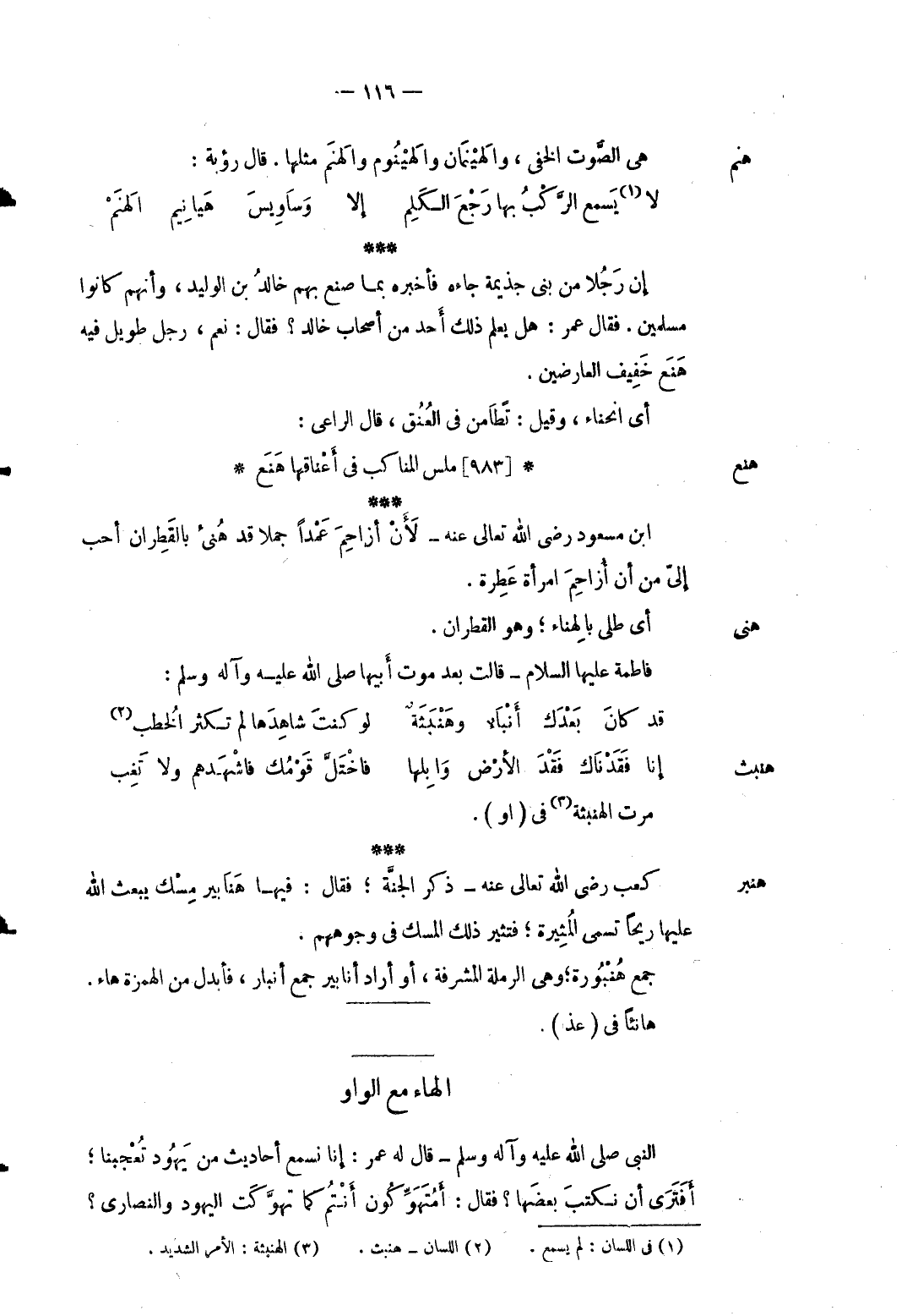 هنى ابْن مَسْعُود رَضِي الله تَعَالَى عَنهُ لِأَن أزاحم عمدا جملا قد هنىء بالقطران أحب إِلَى من أَن أُزاحم امْرَأَة عطرة أَي طلى بالهناء وَهُوَ القطران فَاطِمَة عَلَيْهَا السَّلَام قَالَت بعد موت أَبِيهَا صلى الله عَلَيْهِ وَآله وَسلم: ... قد كانَ بَعْدَك أنباء وهنبثة ... لَو كنت شَاهدهَا لم تكْثر الخُطب