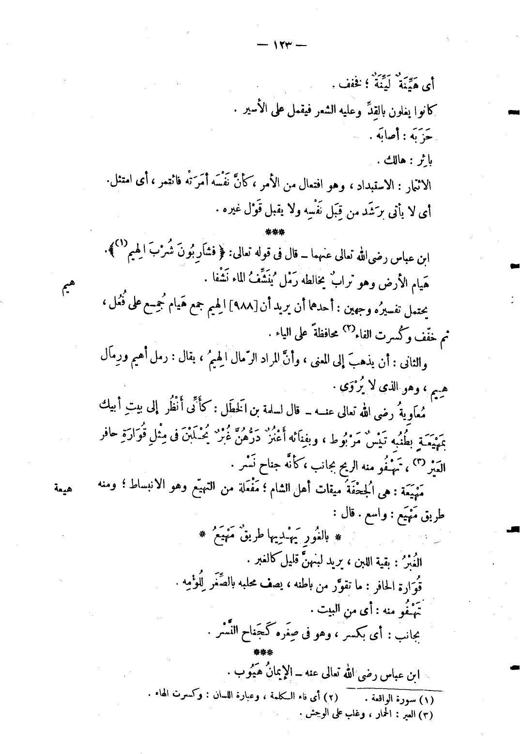 هيم ابْن عَبَّاس رَضِي الله تَعَالَى عَنْهُمَا قَالَ فِي قَوْله تَعَالَى: (فشَارِبُونَ شُرْبَ الهِيم) هيام الأَرْض وَهُوَ تُرَاب يخالطه رمل ينشِّف المَاء نشفا يحْتَمل تَفْسِيره وَجْهَيْن: أَحدهمَا أَن يُرِيد أَن] 988 [الهيم جمع هيام جُمع على فُعل ثمَّ خفف وَكسرت الفاءمحافظة على الْيَاء وَالثَّانِي: أَن يذهب إِلَى الْمَعْنى أَن المُرَاد الرمال الهيم يُقَال: رمل أهيم ورمال هيم وَهُوَ الذى لَا يرْوى