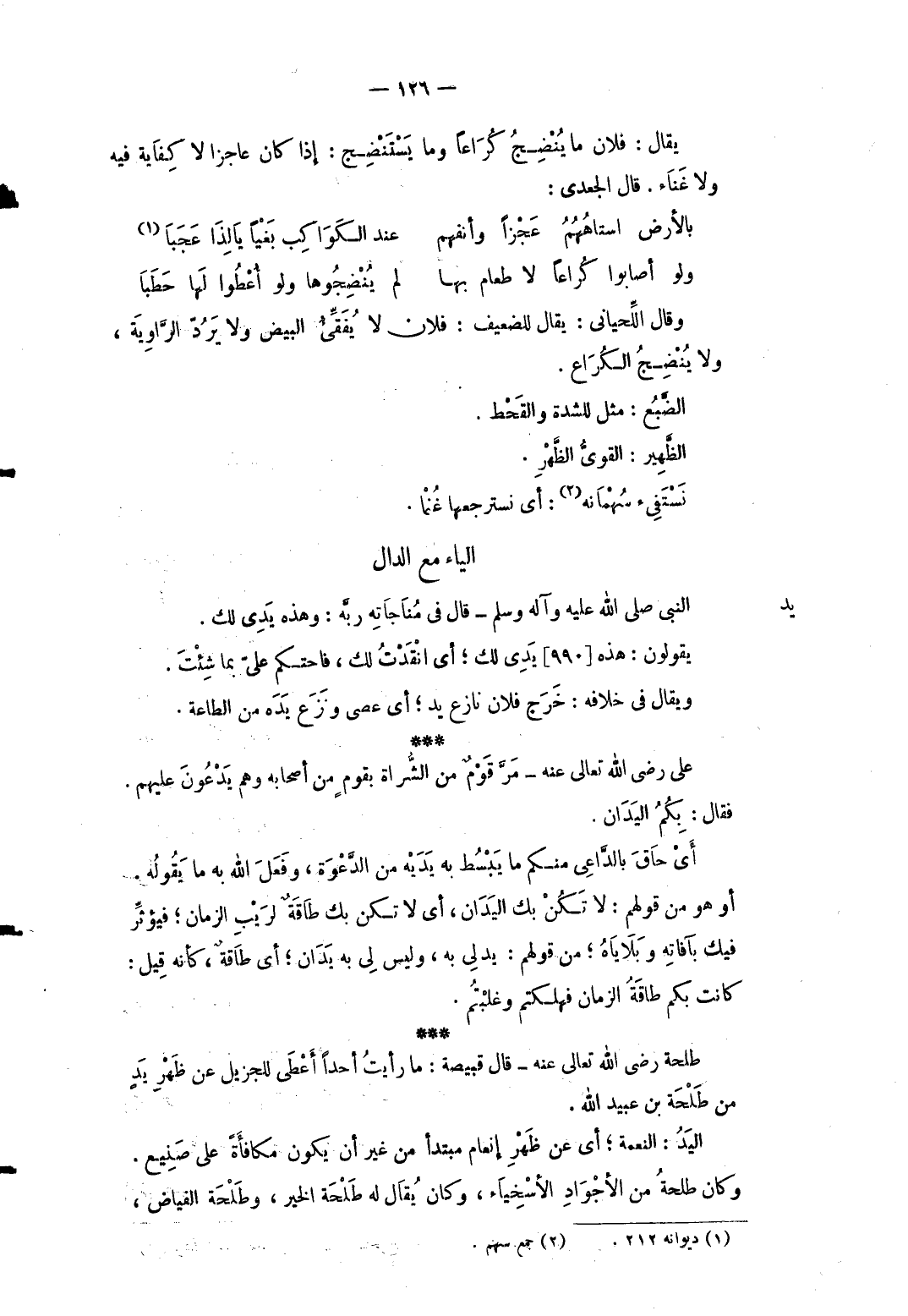يَد النَّبِي صلى الله عَلَيْهِ وَآله وَسلم قَالَ فِي مناجاته ربه: وَهَذِه يَدي لَك يَقُولُونَ: هَذِه] 99 [يَدي لَك أَي انقدت لَك فاحتكم عَليّ بِمَا شِئْت وَيُقَال فِي خِلَافه: خرج فلَان نَازع يَد أَي عصى وَنزع يَده من الطَّاعَة عَليّ رَضِي الله تَعَالَى عَنهُ مر قوم من الشراة بِقوم من أَصْحَابه وهم يدعونَ عَلَيْهِم فَقَالَ: بكم اليدان أَي حاق بالداعي مِنْكُم مَا يبسط بِهِ يَدَيْهِ من الدعْوَة وَفعل الله بِهِ مَا يَقُوله أَو هُوَ من قَوْلهم: لَا تكن بك اليدان أَي لَا تكن بك طَاقَة لريب الزَّمَان فيؤثِّر فِيك بآفاته وبلاياه من قَوْلهم: يُدْلِي بِهِ وَلَيْسَ لي بِهِ يدان أَي طَاقَة كَأَنَّهُ قيل: كَانَت بكم طَاقَة الزَّمَان فهلكتم وغلبتم طَلْحَة رَضِي الله تَعَالَى عَنهُ قَالَ قبيصَة: مَا رَأَيْت أحدا أعْطى للجزيل عَن ظهر يدٍ من طَلْحَة بن عبيد الله الْيَد: النِّعْمَة أَي عَن ظهر إنعام مُبْتَدأ من غير أَن يكون مُكَافَأَة على صَنِيع وَكَانَ طَلْحَة من الأجواد الأسخياء وَكَانَ يُقَال لَهُ طَلْحَة الْخَيْر وَطَلْحَة الْفَيَّاض