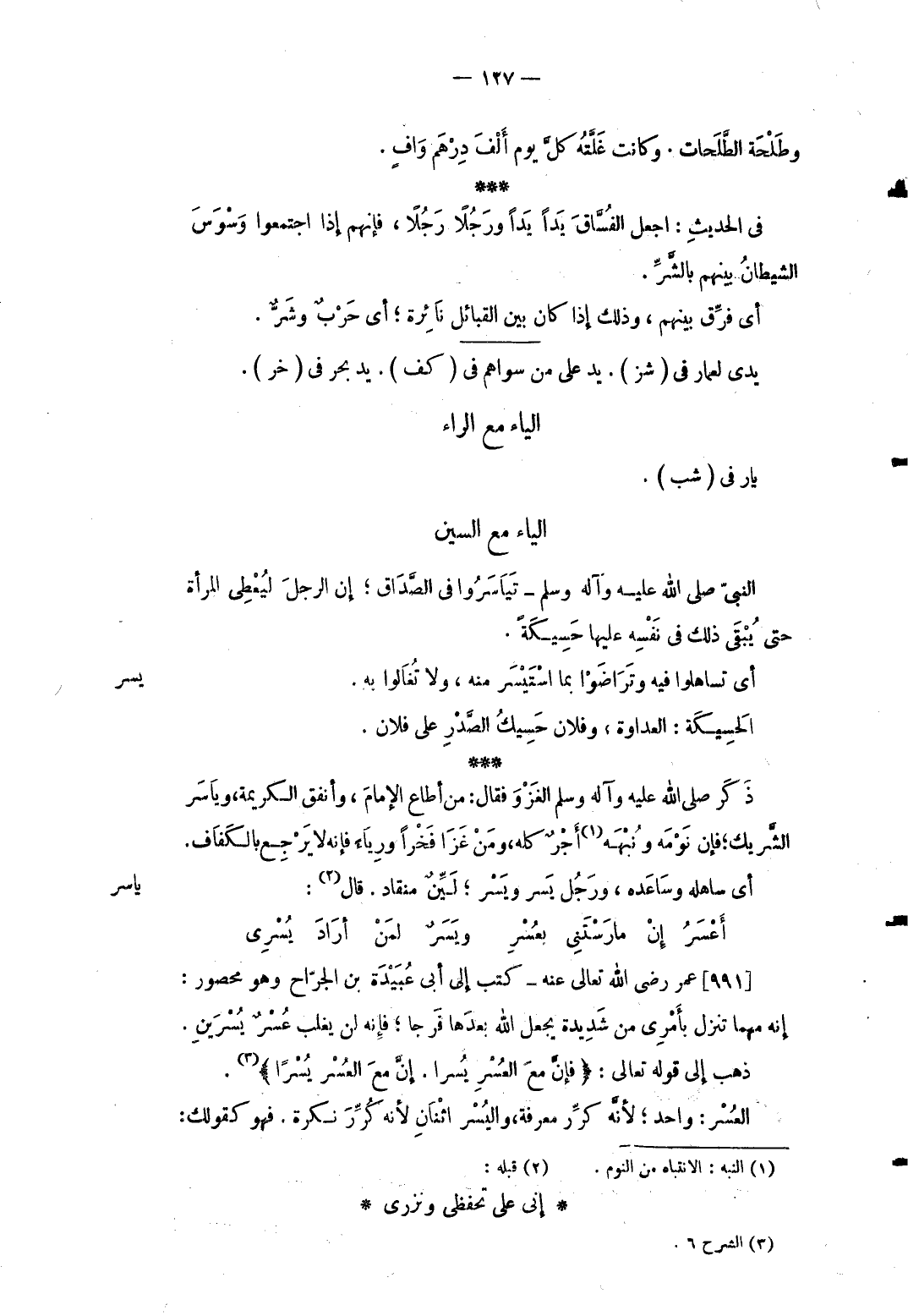 يَاسر ذكر صلى الله عَلَيْهِ وَآله وَسلم الْغَزْو فَقَالَ: من أطَاع الإِمَام وَأنْفق الْكَرِيمَة وياسر الشَّرِيك فَإِن نَومه ونبهه أجر كُله وَمن غزا فخراً ورياءً فَإِنَّهُ لَا يرجع بالكفاف أَي ساهله وساعده وَرجل يسر وَيسر ليِّنٌ منقاد قَالَ: ... أَعْسَرُ إِنْ مارَسْتَنِي بعُسْرِ ... ويَسَرٌ لمَنْ أرَادَ يُسْرِي ... ] 991 [عمر رَضِي الله تَعَالَى عَنهُ كتب إِلَى أبي عُبَيْدَة بن الْجراح وَهُوَ مَحْصُور: إِنَّه مهما تنزل بأَمْري من شَدِيدَة يَجْعَل الله بعْدهَا فرجا فَإِنَّهُ لن يغلب عُسر يسرين ذهب إِلَى قَوْله تَعَالَى: (فإنَّ معَ العُسْرِ يُسرا إنَّ معَ العُسْر يُسْراً) الْعسر: وَاحِد لِأَنَّهُ كرر معرفَة واليسر اثْنَان لِأَنَّهُ كرر نكرَة فَهُوَ كَقَوْلِك: