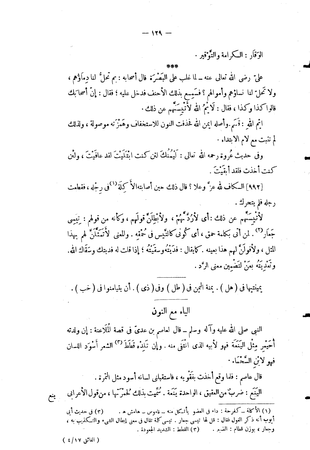 الْوَقار: الْكَرَامَة والتوقير عَليّ رَضِي الله تَعَالَى عَنهُ لما غلب على الْبَصْرَة قَالَ أَصْحَابه: بِمَ تحلُّ لنا دِمَاؤُهُمْ وَلَا تحل لنا نِسَاؤُهُم وَأَمْوَالهمْ فَسمع بذلك الْأَحْنَف فَدخل عَلَيْهِ فَقَالَ: إِن أَصْحَابك قَالُوا كَذَا وَكَذَا فَقَالَ: لايم الله لأتيسنَّهم عَن ذَلِك ايم الله: قسم وَأَصله ايمن الله فحذفت النُّون للاستخفاف وهمزته مَوْصُولَة وَلذَلِك لم تثبت مَعَ لَام الِابْتِدَاء وَفِي حَدِيث عُرْوَة رَحمَه الله تَعَالَى: ليمنك لَئِن كنت ابْتليت لقد عافيت وَلَئِن كنت أخذت فَلَقَد أبقيت] 992 [الْكَاف لله عز وَعلا قَالَ ذَلِك حِين أَصَابَته الْأكلَة فِي رجله فَقطعت رجله فَلم يَتَحَرَّك لأتيسنهم عَن ذَلِك: أَي لاردَّنهم ولابطلنَّ قَوْلهم وَكَأَنَّهُ من قَوْلهم: تيسي جعار لمن أَتَى بِكَلِمَة حمق أَي كوني كالتيَّس فِي حمقه وَالْمعْنَى لأتمثَّلنَّ لَهُم بِهَذَا الْمثل ولأقولن لَهُم هَذَا بِعَيْنِه كَمَا يُقَال: فديته وسقيته إِذا قلت فديتك وسقاك الله وتعديته بعن لتضمين معنى الرَّد