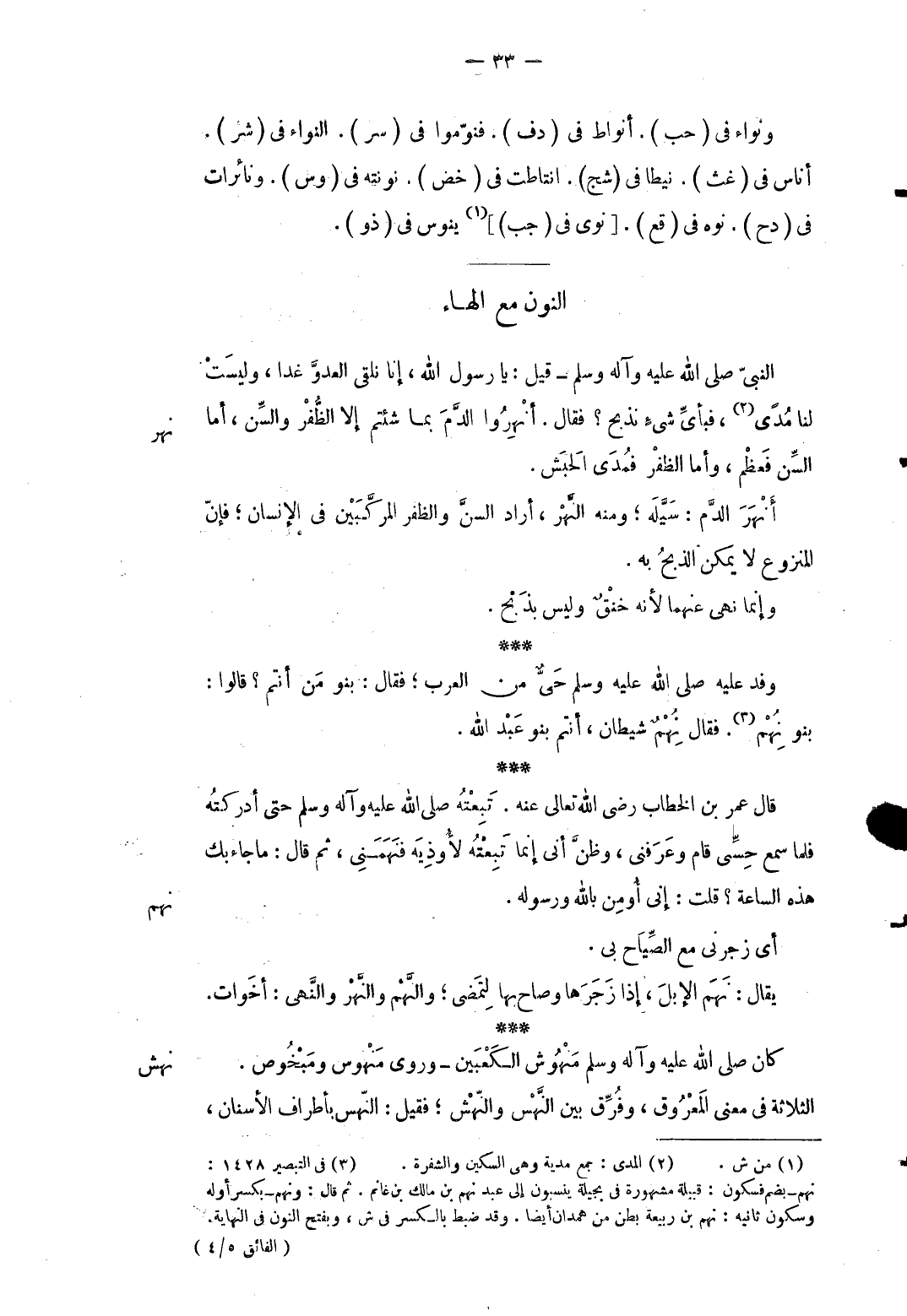 نهر النَّبِي صلى الله عَلَيْهِ وَآله وَسلم قيل يَا رَسُول الله إِنَّا نلقى الْعَدو غَدا وَلَيْسَت لنا مُدىً فبأيِّ شيءٍ نذبح فَقَالَ. أنهروا الدَّم بِمَا شِئْتُم إِلَّا الظفر وَالسّن أما السن فَعظم وَأما الظفر فمدى الْحَبَش. أنهر: سيَّله وَمِنْه النَّهر أَرَادَ السنَّ وَالظفر المركبين فِي الْإِنْسَان فَإِن المنزوع لَا يُمكن الذّبْح بِهِ. وَإِنَّمَا نهى عَنْهُمَا لِأَنَّهُ خنق وَلَيْسَ بِذبح. وَفد عَلَيْهِ صلى الله عَلَيْهِ وَسلم حيٌّ من الْعَرَب فَقَالَ: بَنو من انتم قَالُوا: بَنو نهم. فَقَالَ نهم شَيْطَان أَنْتُم بَنو عبد الله.