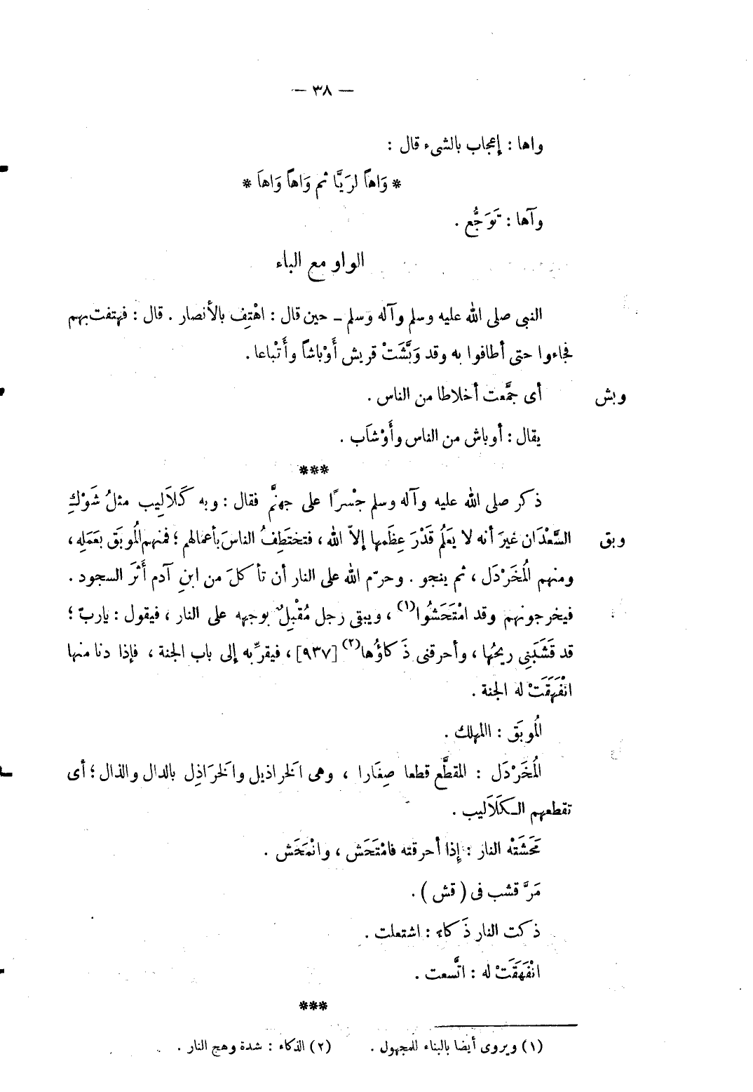 وبق ذكر صلى الله عَلَيْهِ وَآله وَسلم جِسْرًا على جَهَنَّم فَقَالَ: وَبِه كلاليب مثل شوك السعدان غير أَنه لَا يعلم قدر عظمها إِلَّا الله فتختطف النَّاس بأعمالهم فَمنهمْ الموبق بِعَمَلِهِ وَمِنْهُم المخردل ثمَّ ينجو. وَحرم الله على النَّار أَن تَأْكُل من ابْن آدم أثر السُّجُود. فيخرجونهم وَقد امتحشوا وَيبقى رجل مقبل بِوَجْهِهِ على النَّار فَيَقُول: يارب قد قشبنى رِيحهَا وأحرقنى ذكاؤها [937] فَيقر بِهِ إِلَى بَاب الْجنَّة فَإِذا دنا مِنْهَا انفهقت لَهُ الْجنَّة. الموبق: المهلك. المخردل: المقطع قطعا صغَارًا وَهِي الخراذيل والخراذل بِالدَّال وَالدَّال أَي تقطعهم الكلاليب. محشته النَّار: إِذا أحرقته فامتحش وانمحش. مر قشب فِي (قَشّ) . ذكت النَّار ذكاء: اشتعلت. انفهقت لَهُ: اتسعت.