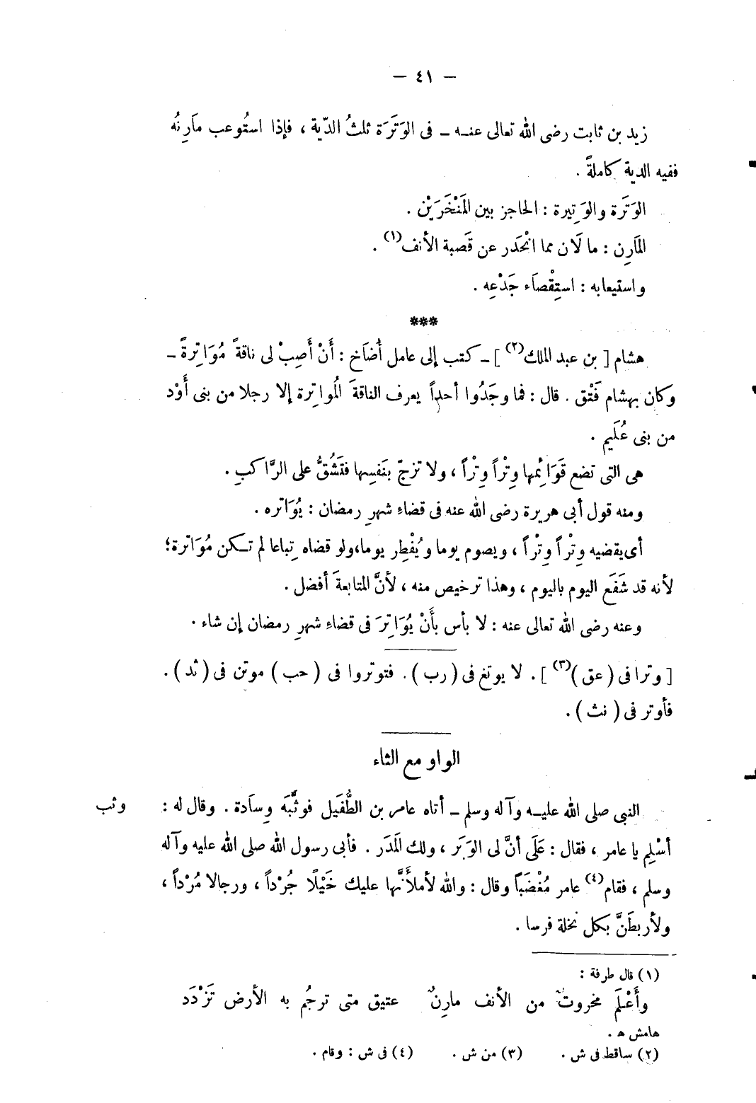 زيد بن ثَابت رَضِي الله تَعَالَى عَنهُ فِي الوترة ثلث الدِّيَة فَإِذا استوعب مارنه فَفِيهِ الدِّيَة كَامِلَة الوترة والوتيرة: الحاجز بَين المنخرين المارن: مَا لَان مِمَّا انحدر عَن قَصَبَة الْأنف واستيعابه: استقصاء جدعه هِشَام] بن عبد الْملك [كتب إِلَى عَامل أضاخ: أَن أصب لى نَاقَة مواترة وَكَانَ بِهِشَام فتق قَالَ: فَمَا وجدوا أحدا يعرف النَّاقة المواترة إِلَّا رجلا من بنى أود من بنى عليم هِيَ الَّتِي تضع قَوَائِمهَا وترا وترا وَلَا تزج بِنَفسِهَا فتشق على الرَّاكِب وَمِنْه قَول أبي هُرَيْرَة رضى الله عَنهُ فِي قَضَاء شهر رَمَضَان: يواتره أَي يَقْضِيه وترا وترا ويصوم يَوْمًا وَيفْطر يَوْمًا وَلَو قَضَاهُ تباعا لم تكن مواترة لِأَنَّهُ قد شفع الْيَوْم بِالْيَوْمِ وَهَذَا ترخيص مِنْهُ لِأَن الْمُتَابَعَة أفضل وَعنهُ رضى الله تَعَالَى عَنهُ: لَا بَأْس بِأَن يواتر فِي قَضَاء شهر رَمَضَان إِن شَاءَ