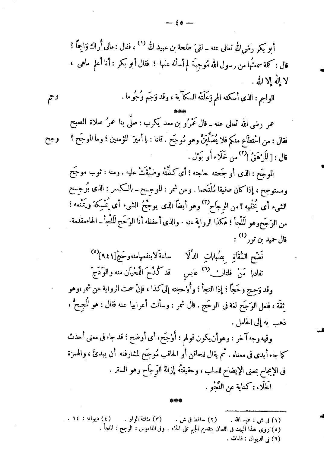 تفاديا مَنْ فلتان عابسٍ ... قد كُدِّحَ اللِّحْيَان مِنْهُ والوَدَجْ ... وَقد وَحج وحجاً إِذا التجأ وأوحجته إِلَى كَذَا فَإِن صحت الرِّوَايَة عَن شمر وَهُوَ ثِقَة فَلَعَلَّ الوجح لُغَة فى الوجح. قَالَ شمر: وَسَأَلت أَعْرَابِيًا عَنهُ فَقَالَ: هُوَ المُجِحُّ ذهب بِهِ إِلَى الْحَامِل. وَفِيه وَجه آخر: وَهُوَ أَن يكون قَوْلهم: أوجح أَي أوضح قد جَاءَ فِي معنى أحدث كَمَا جَاءَ أبدى فِي مَعْنَاهُ. ثمَّ يُقَال للحاقن أَو الحاقب موجح لمشارفته أَن يبدئ والهمزة فِي الإيجاح بِمَعْنى الْإِيضَاح للسلب وَحَقِيقَته إِزَالَة الوجاح وَهُوَ السّتْر. الْخَلَاء: كِتَابَة عَن النجو.