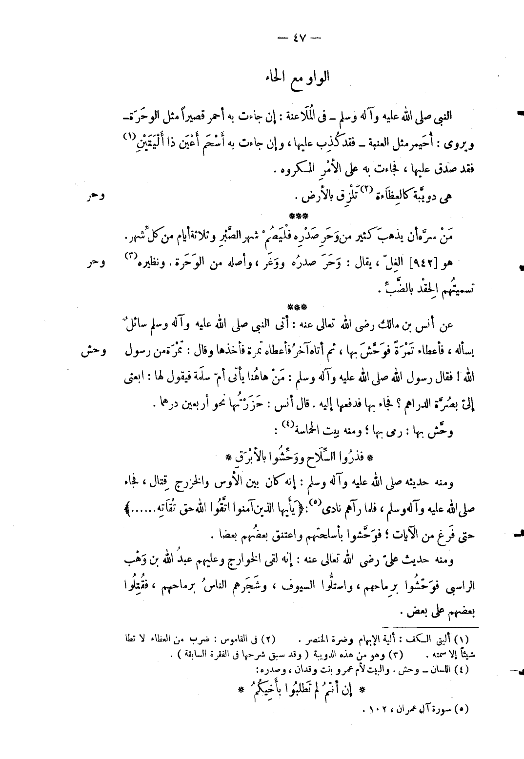 وَحش عَن أنس بن مَالك رَضِي الله تَعَالَى عَنهُ: أَتَى النَّبِي صلى الله عَلَيْهِ وَآله وَسلم سَائل يسْأَله فأعطاء تَمْرَة فوحَّش بهَا ثمَّ أَتَاهُ آخر فَأعْطَاهُ تَمْرَة فَأَخذهَا وَقَالَ: تَمْرَة من رَسُول الله فَقَالَ رَسُول الله صلى الله عَلَيْهِ وَآله وَسلم: من هَاهُنَا يَأْتِي أم سَلمَة فَيَقُول لَهَا: ابعثي إليّ بصرَّة الدَّرَاهِم فجَاء بهَا فَدَفعهَا إِلَيْهِ. قَالَ أنس: حزرتها نَحْو أَرْبَعِينَ درهما وَحش بهَا: رمى وَمِنْه بَيت الحماسة: ... فذرُوا السِّلاَح ووَحِّشُوا بالأبْرَقِ ... وَمِنْه حَدِيثه صلى الله عَلَيْهِ وَآله وَسلم: إِنَّه كَانَ بَين الْأَوْس والخزرج قتال فجَاء صلى الله عَلَيْهِ وَآله وَسلم فَلَمَّا رَآهُمْ نَادَى (يأيها الَّذين آمنو اتَّقُوا الله حق تُقَاتِه.) حَتَّى فرغ من الْآيَات فوحشوا بأسلحتمهم واعتنق بَعضهم بَعْضًا. وَمِنْه حَدِيث عَليّ رَضِي الله تَعَالَى عَنهُ: إِنَّه لَقِي الْخَوَارِج وَعَلَيْهِم عبد الله بن وهب الراسي فوحشوا برماحهم واسلوا السيوف وشجرهم النَّاس برماحهم فقُتلوا بَعضهم على بعض.