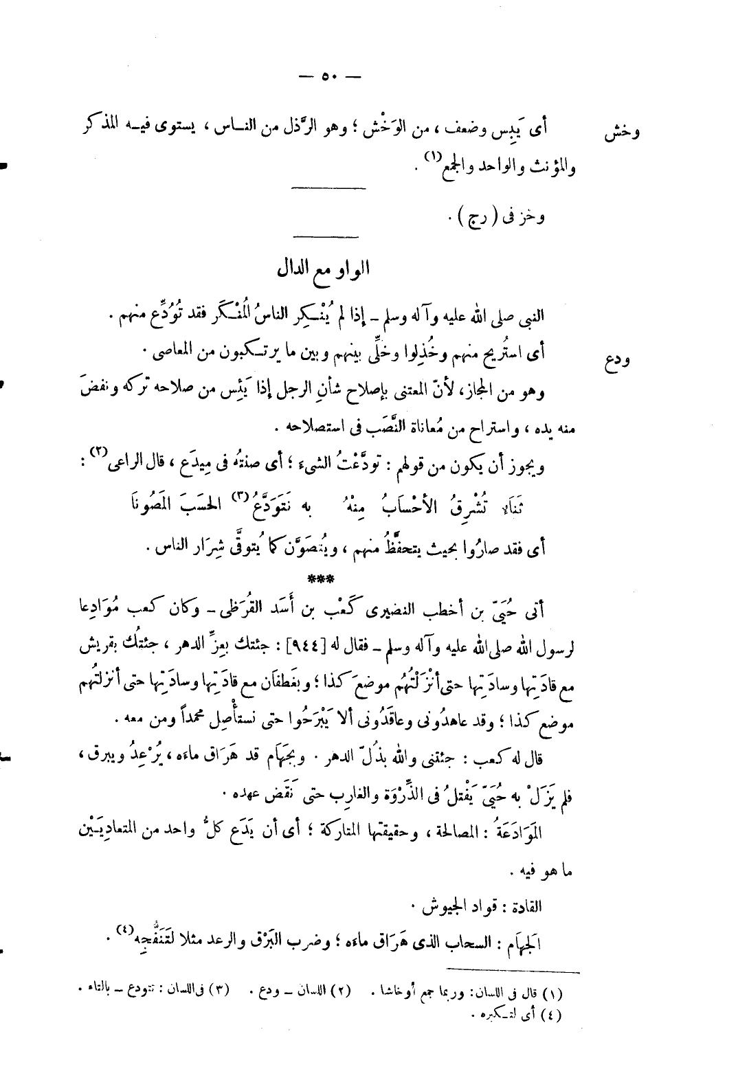 ودع النَّبِي صلى الله عَلَيْهِ وَآله وَسلم إِذا لم يُنكر النَّاس الْمُنكر فقد تودع مِنْهُم. أَي استُريح مِنْهُم وخُذلوا وخلِّي بَينهم وَبَين مَا يرتكبون من الْمعاصِي. وَهُوَ من الْمجَاز لِأَن المعتني بإصلاح شَأْن الرجل إِذا يئس من صَلَاحه تَركه ونفض مِنْهُ يَده واستراح من معاناة النَّصب فِي استصلاحه. وَيجوز أَن يكون من قَوْلهم: تودَّعت الشَّيْء أَي صنته فى ميدع فال الرَّاعِي: ... ثَنَاءٌ تُشْرِقُ الأحْسَابُ مِنْهُ ... بِهِ نَتَوَدَّعُ الحَسبَ المَصُونا ... أَي فقد صَارُوا بِحَيْثُ يتحفظ مِنْهُم ويتصون كَمَا يتوقى شرار النَّاس. أَنى حييّ بن أَخطب النضيري كَعْب بن أَسد القُرظي وَكَانَ كَعْب موادعا لرَسُول الله صلى الله عَلَيْهِ وَآله وَسلم فَقَالَ لَهُ [944] : جئْتُك بعز الدَّهْر جئْتُك بِقُرَيْش مَعَ قادتها وسادتها حَتَّى أنزلتهم مَوضِع كَذَا وبغطفان مَعَ قادتها وسادتها حَتَّى أنزلتهم مَوضِع كَذَا وَقد عاهدوني وعاقدونى أَلا يبرحوا حَتَّى نستأصل مُحَمَّدًا وَمن مَعَه. قَالَ لَهُ كَعْب: جئتني وَالله بذل الدَّهْر. وبجنهام قد هراق مَاءَهُ يرعد ويبرق فَلم يزل بِهِ حييّ يفتل فِي الذرْوَة وَالْغَارِب حَتَّى نقض عَهده. الْمُوَادَعَة: الْمُصَالحَة وحيقتها المتاركة أَي أَن يدع كل وَاحِد من المتعاديين مَا هُوَ فِيهِ. القادة: قواد الجيوش. الجهام: السَّحَاب الَّذِي هراق مَاءَهُ وَضرب الْبَرْق والرعد مثلا لنفجه.