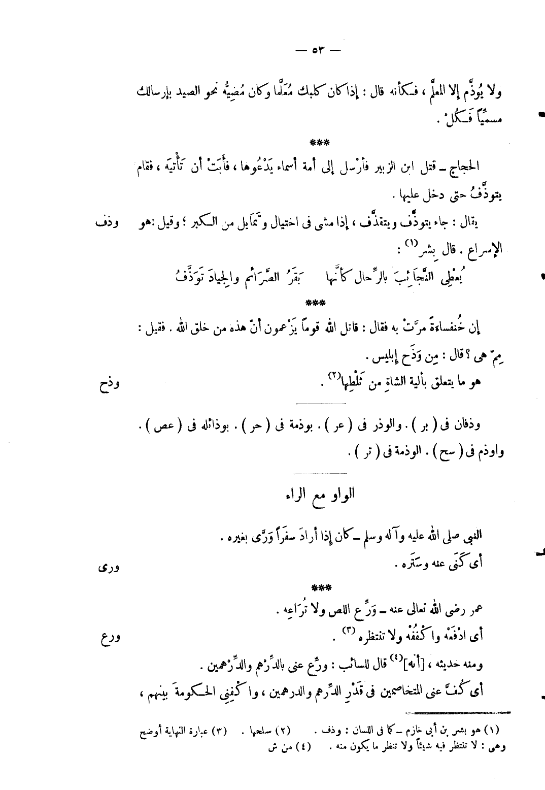 وذف الْحجَّاج قتل ابْن الزبير فَأرْسل إِلَى أمة أَسمَاء يدعوها فَأَبت أَن تَأتيه فَقَالَ يتوذَّف حَتَّى دخل عَلَيْهَا. يُقَال: جَاءَ يتوذف ويتقذف إِذا مَشى فِي اختيال وتمايل من الْكبر وَقيل هُوَ الْإِسْرَاع. قَالَ بشر: ... يُعْطِى النَّجَائِبَ بالرِّحال كأنَّها ... بَقَرُ الصَّرَائم والجِيادَ تَوَذَّفُ ...