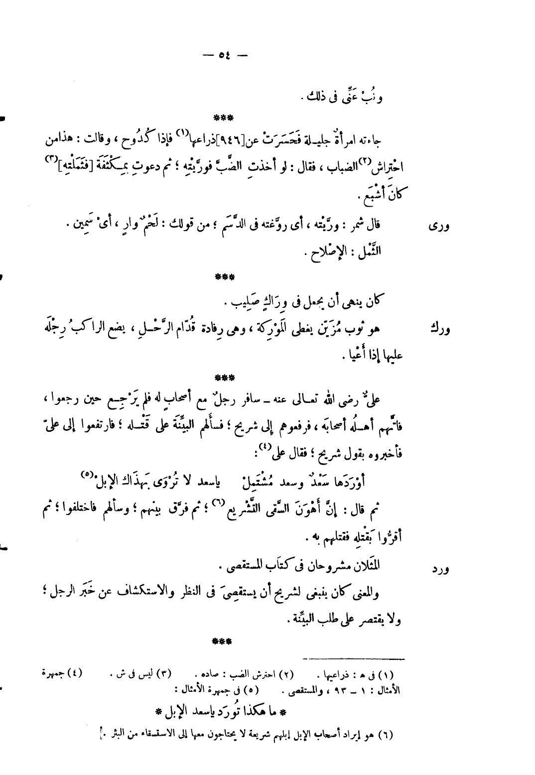 ورد عَليّ رَضِي الله تَعَالَى عَنهُ سَافر رجل مَعَ أَصْحَاب لَهُ فَلم يرجع حِين رجعُوا فاتَّهم أَهله أَصْحَابه فرفعوهم إِلَى شُرَيْح فَسَأَلَهُمْ الْبَيِّنَة على قَتله فَارْتَفعُوا إِلَى عَليّ فأخبروه بقول شُرَيْح فَقَالَ عَليّ: ... أوْرَدَها سَعْدٌ وَسعد مُشْتَمل ... ياسعد لَا تُرْوَي بَهذَاك الإبلْ ... ثمَّ قَالَ إِن أَهْون السَّقي التشريع ثمَّ فرَّق بَينهم وسألهم فَاخْتَلَفُوا ثمَّ أقرُّوا بقتْله فَقَتلهُمْ بِهِ. المثلان مشروحان فِي كتاب المستقصي. وَالْمعْنَى كَانَ يَنْبَغِي لشريح أَن يستقصي فِي النّظر والاستكشاف عَن خبر الرجل وَلَا يتقصر على طلب الْبَيِّنَة.